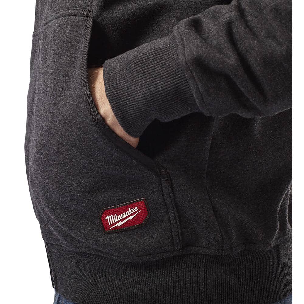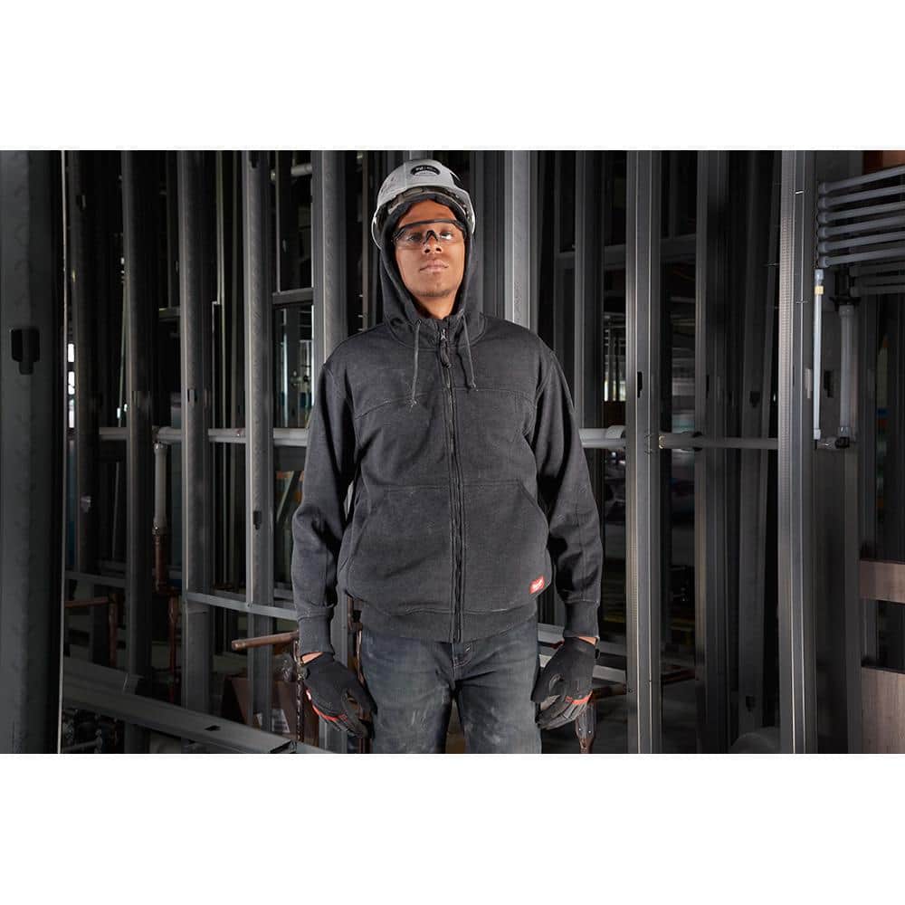 Built for the jobsite and the elements, this Milwaukee NO DAYS OFF hooded sweatshirt combines wind- and water-resistant protection with a warm fleece lining. Reinforced pockets and forearms, rib-knit cuffs/waist, and a fitted, hard-hat-friendly hood deliver durable comfort in cold, wet conditions. Includes a bonus black cuffed knit hat for added warmth.