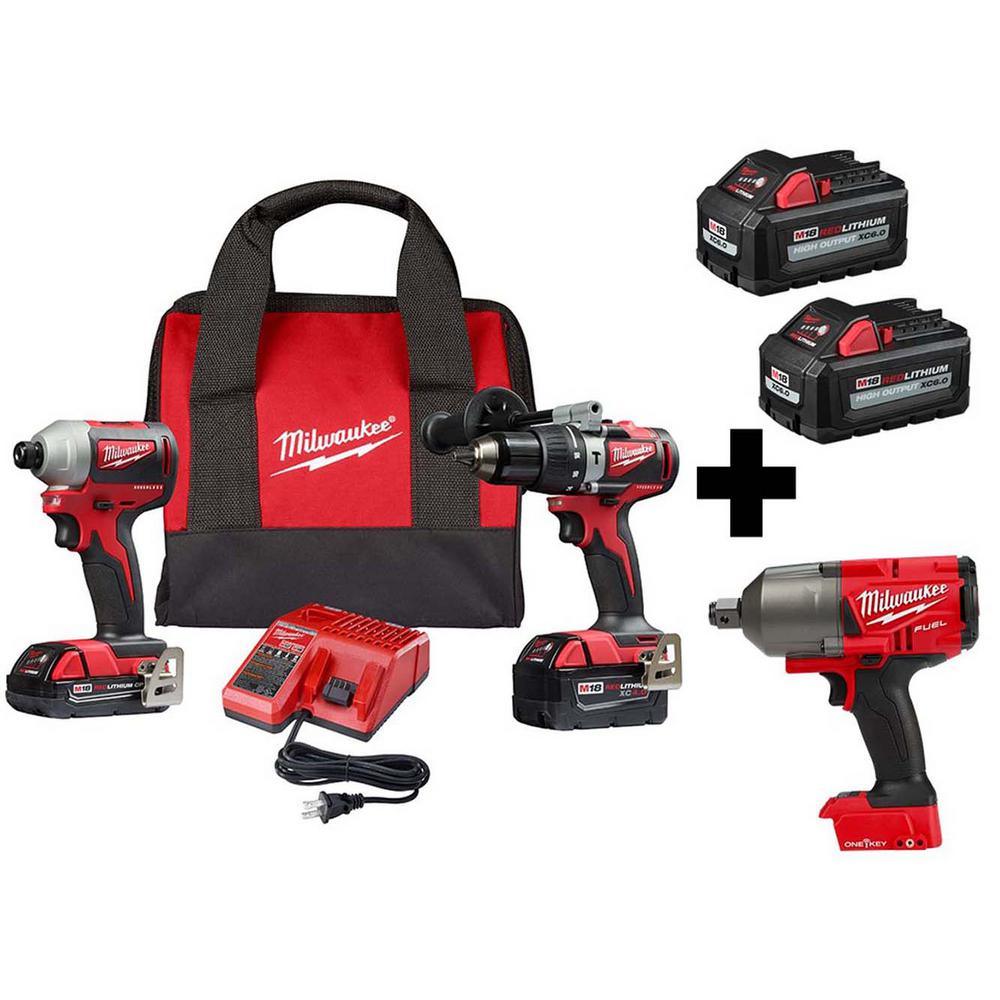 • Includes: 2902-20 hammer drill driver, 2850-20 impact driver, (1) M18 compact REDLITHIUM 2.0 Ah battery (48-11-1820), (1) M18 REDLITHIUM 4.0 Ah XC extended capacity battery (48-11-1840), (1) M18 and M12 multi-voltage charger (48-59-1812), (1) belt clip, (1) contractor bag, (1) 2646-20 M18 2-speed grease gun (1) 48 in. flex hose with spring guard, (1) high pressure grease coupler, (2) M18 REDLITHIUM HIGH OUTPUT XC 6.0 Ah battery packs