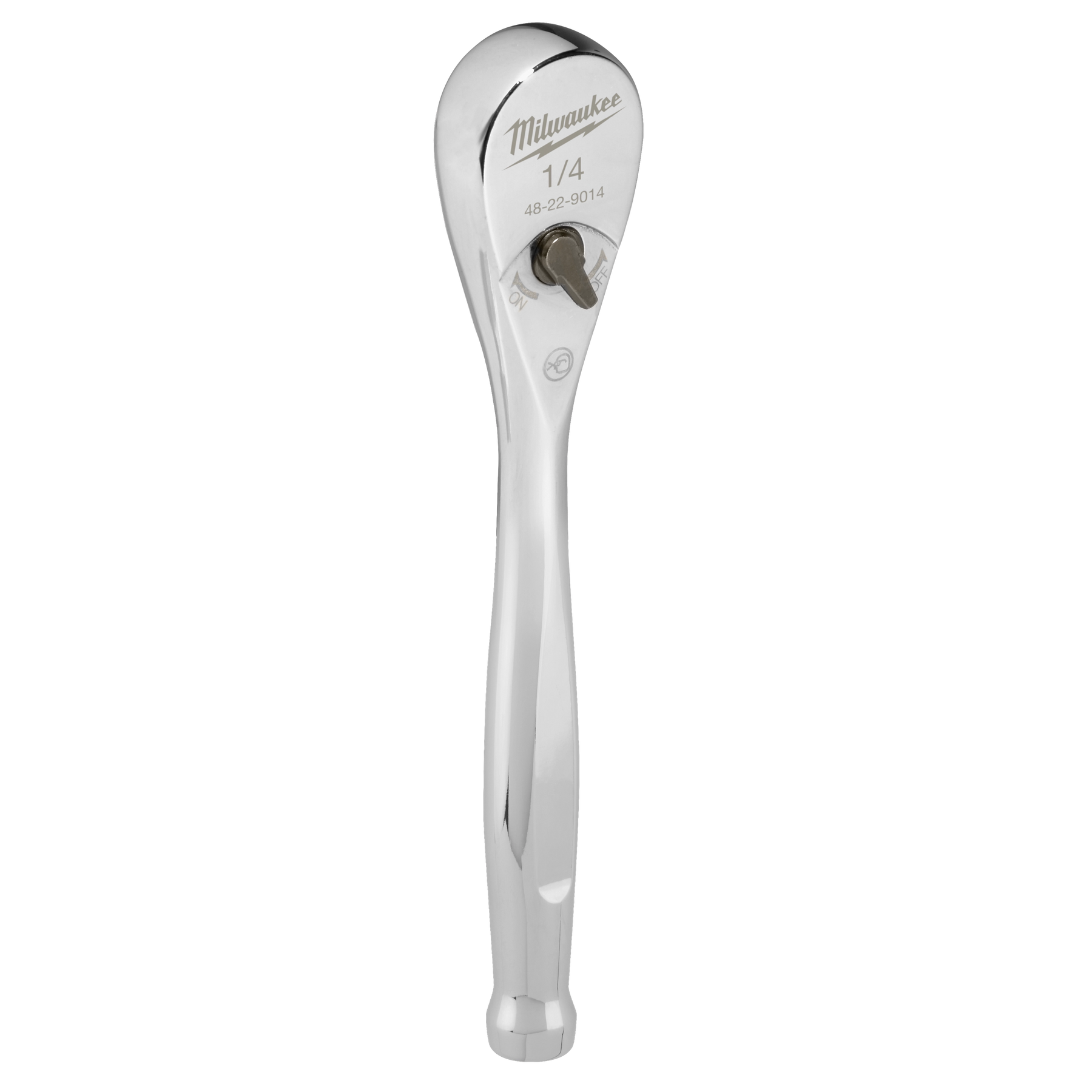 A compact 1/4 in. drive ratchet and socket set with Milwaukee’s FOUR FLAT Sides that deter rolling and allow wrenching in tight spaces. The 90‑tooth ratchet delivers 4° arc swing for precision access, with clearly stamped SAE and metric sizes in a durable hard‑shell case backed by a Lifetime Guarantee.