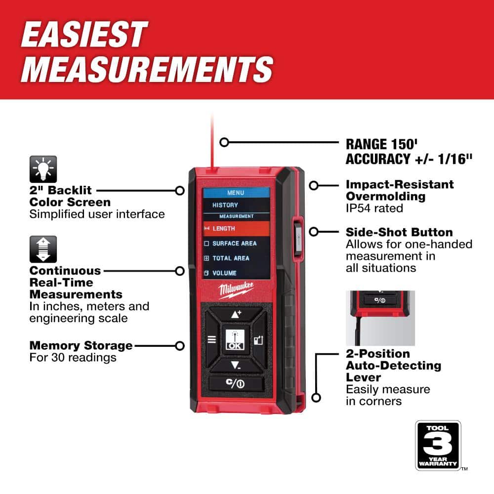 Add the Milwaukee 150 ft. Laser Distance Meter to your kit today and measure faster, clearer, and more accurately on every project.