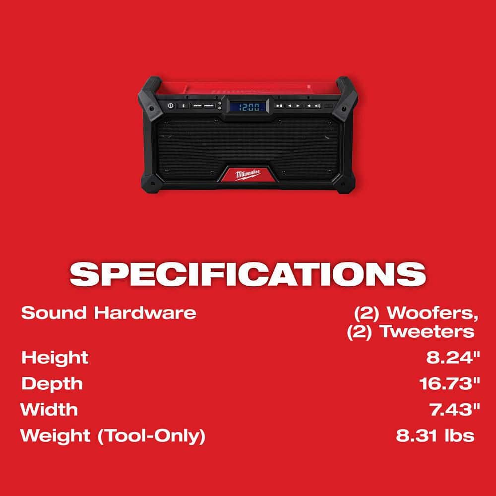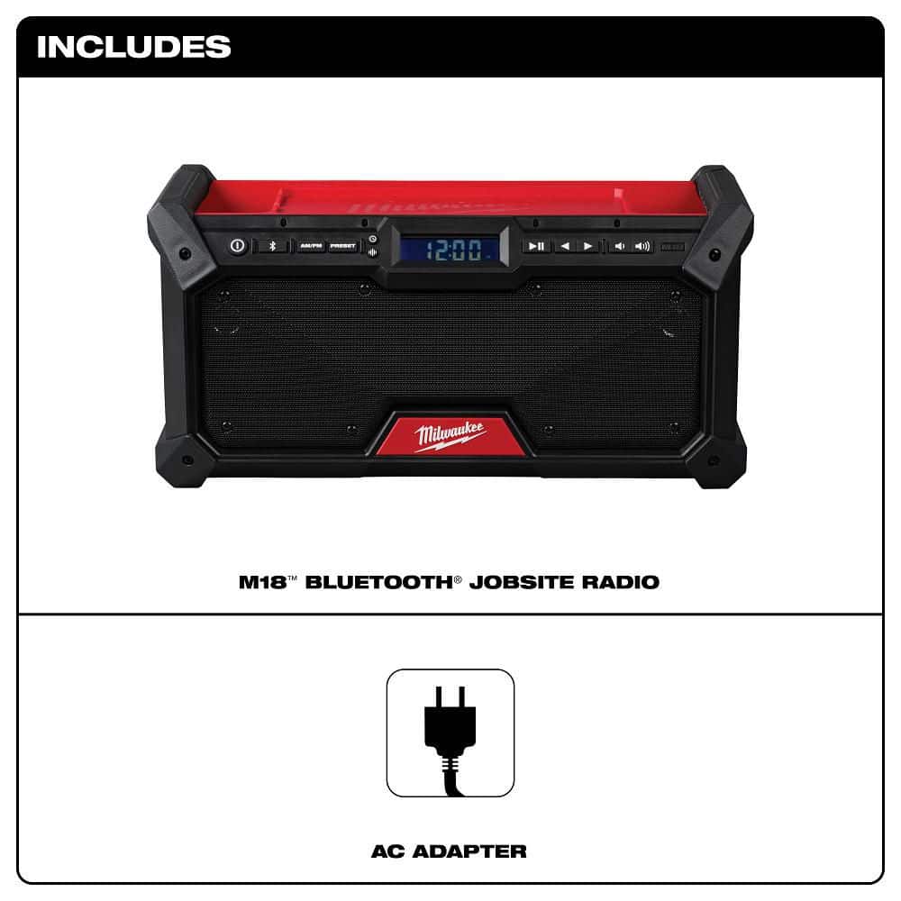 Milwaukee’s M18 Bluetooth Jobsite Radio delivers balanced, powerful sound with dual 3.5 in. woofers and high‑range tweeters. Built for harsh conditions, it’s water, dust, and impact resistant, runs on any M18 battery or AC power, and features USB‑C 3.0A device charging and Bluetooth 5.0 streaming up to 120 ft.