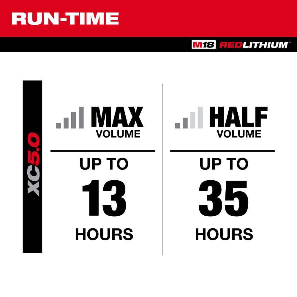 • Long Runtime: Up to 13 hours at max volume with an M18 XC5.0 battery