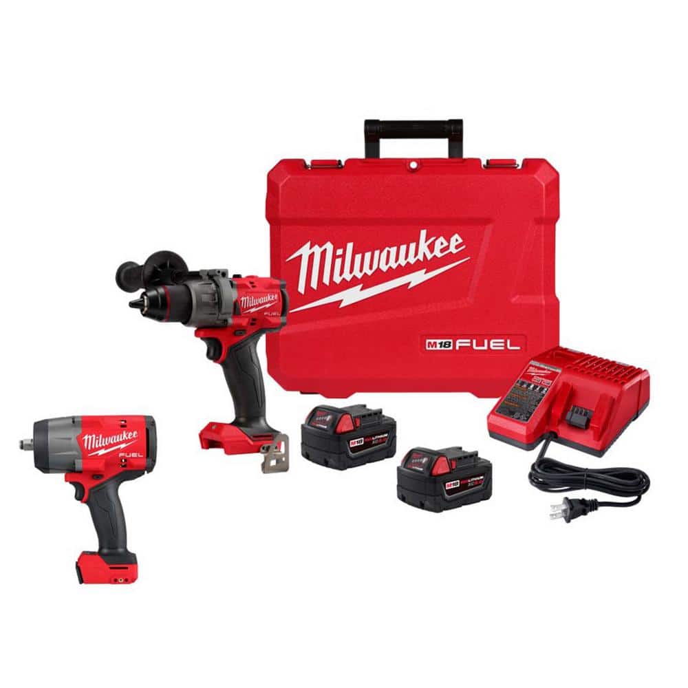 Milwaukee M18 FUEL 18V Li‑Ion Brushless 1/2 in. Hammer Drill/Driver Kit with High‑Torque Impact Wrench (2 Batteries, Charger, Case)