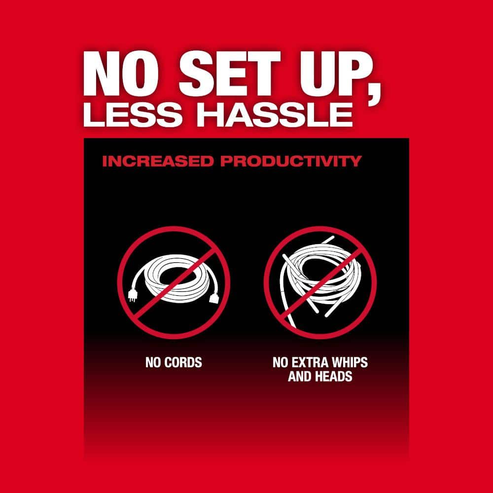 • Cordless Productivity: No extension cords or extra whips for faster setup and safer job sites