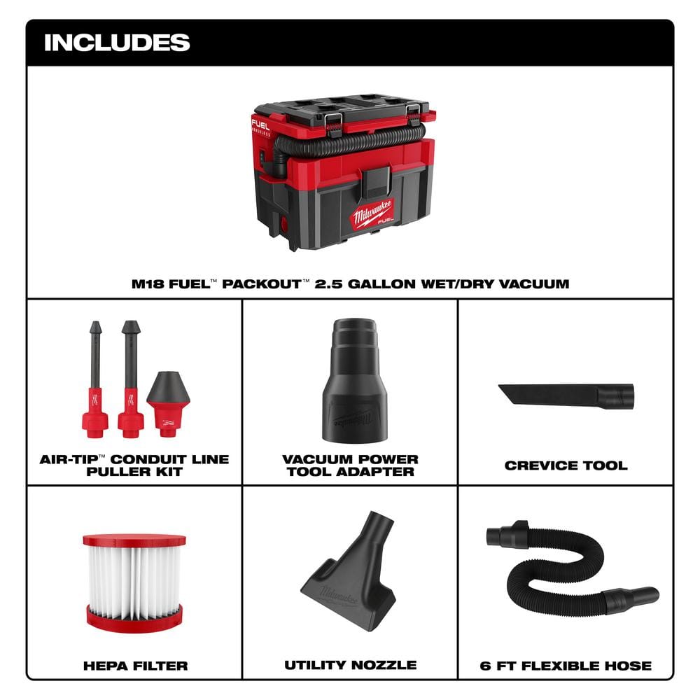 Milwaukee M18 FUEL PACKOUT 18-Volt Cordless 2.5 Gal. Wet/Dry Vacuum + AIR-TIP Conduit Line Puller Kit