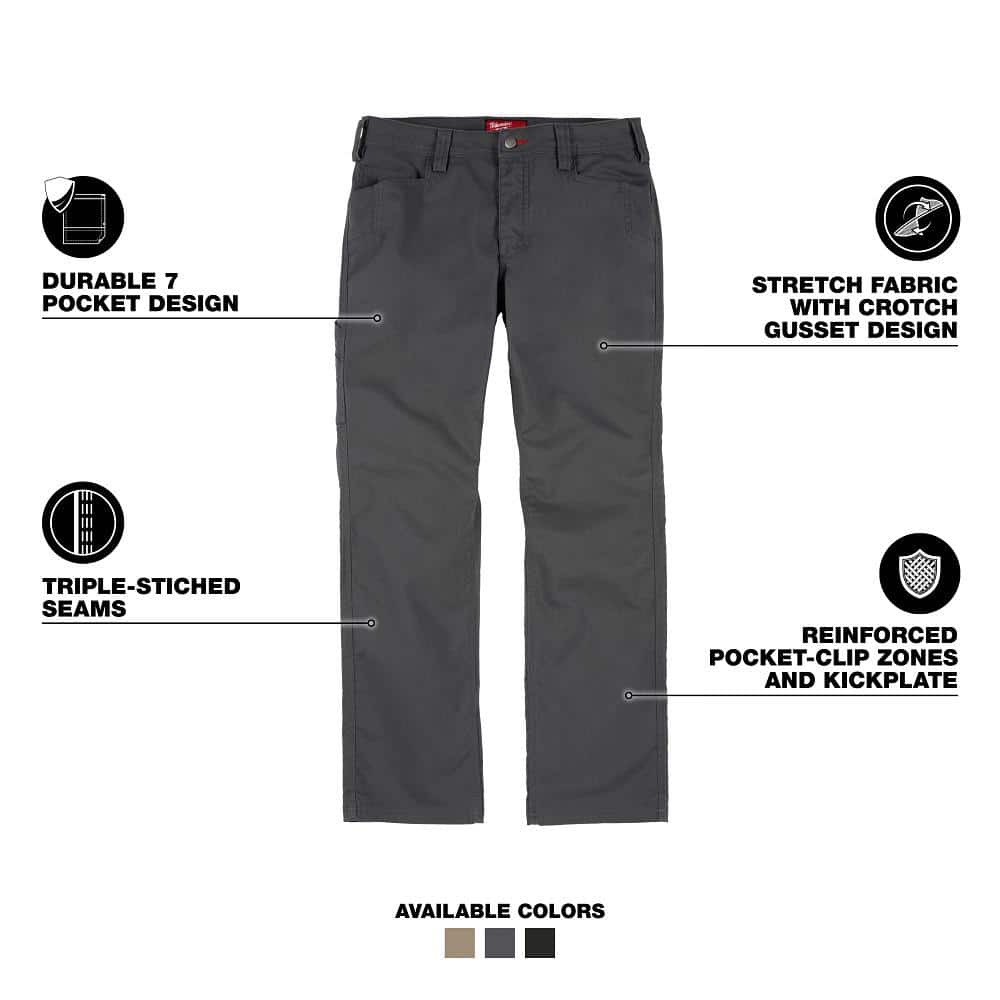 Built for tough jobs, these Milwaukee men's work pants use a tear- and abrasion-resistant cotton/polyester blend with built-in stretch. Reinforced tool clip-on zones, triple-stitched seams, and a knee-to-knee crotch gusset deliver durability and mobility, while 7 pockets keep essentials close.