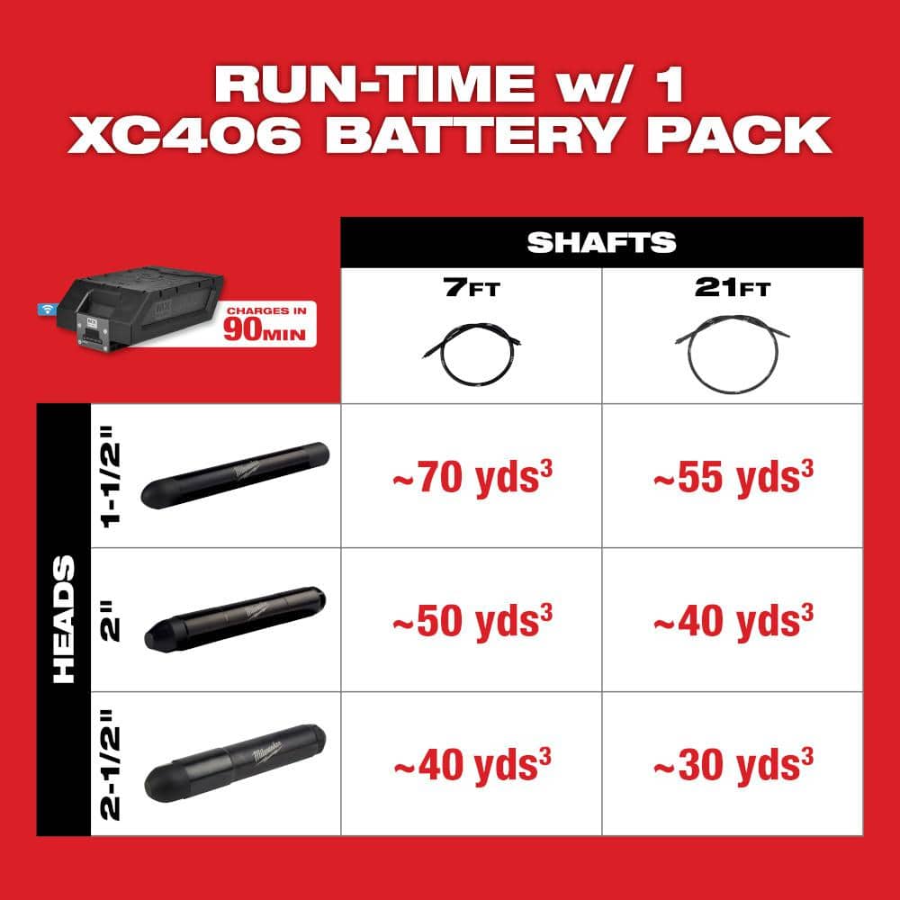 | Runtime (per charge) | Up to 45 yds³ with 2 in. head & 14 ft shaft |