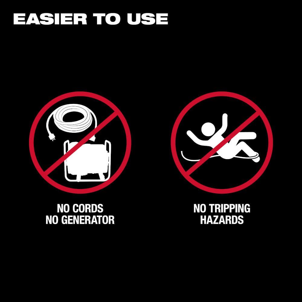 - Cordless Power: Eliminates extension cords and generators to reduce tripping hazards and setup time.