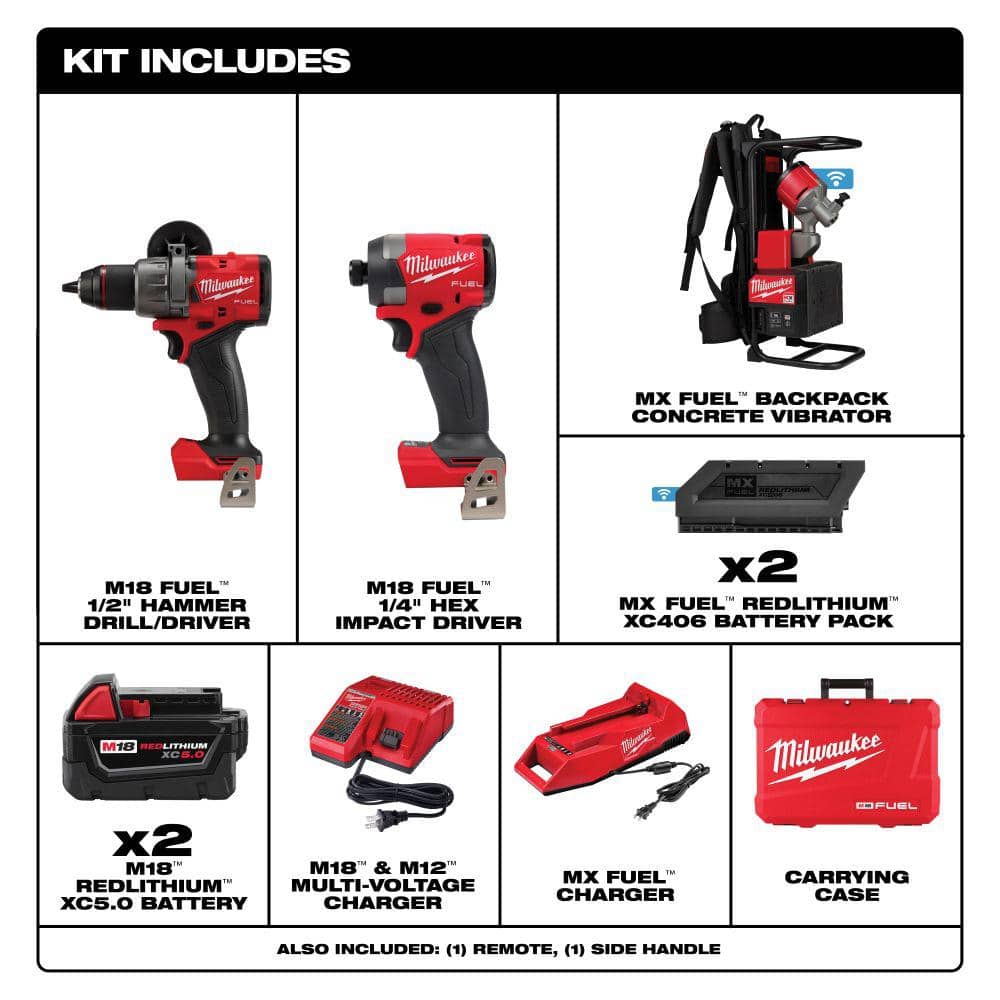Milwaukee MX FUEL Lithium‑Ion Cordless Concrete Vibrator Kit with M18 FUEL Hammer Drill/Impact Driver Combo (Model MXF371-2XC-3697-22)