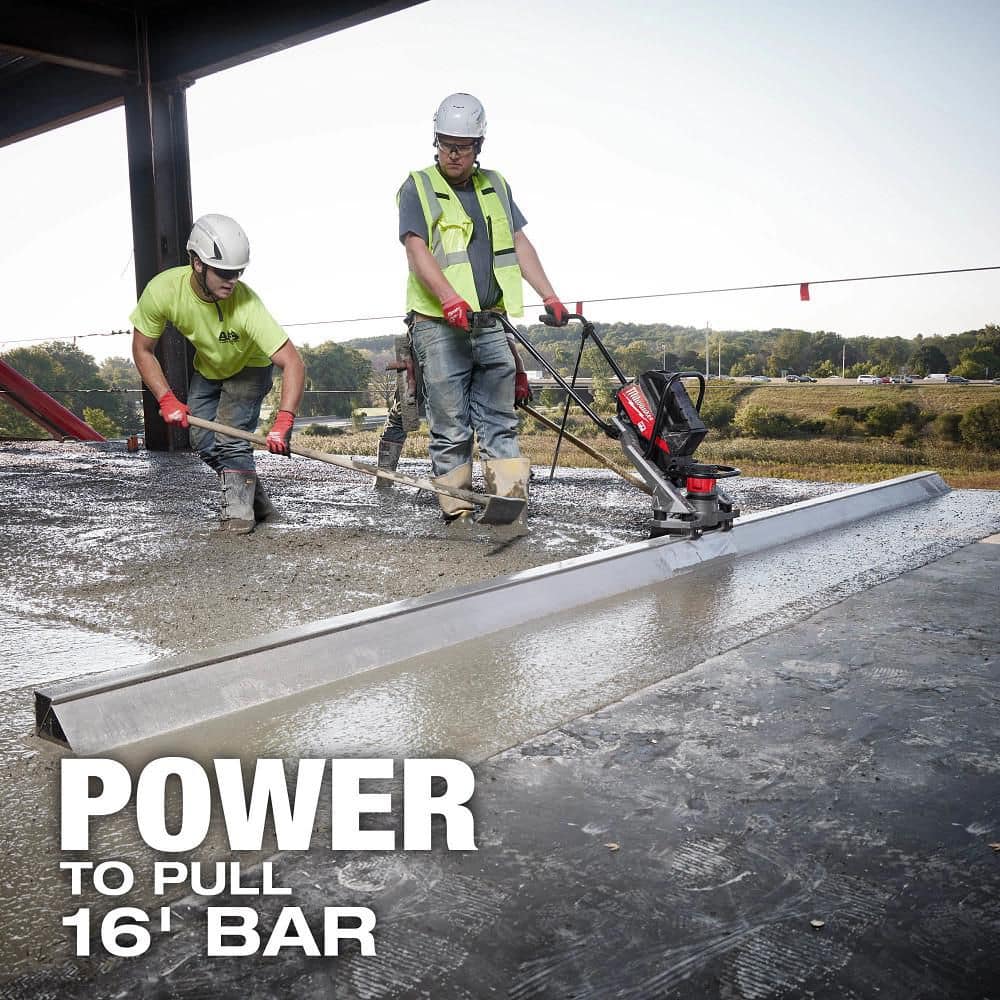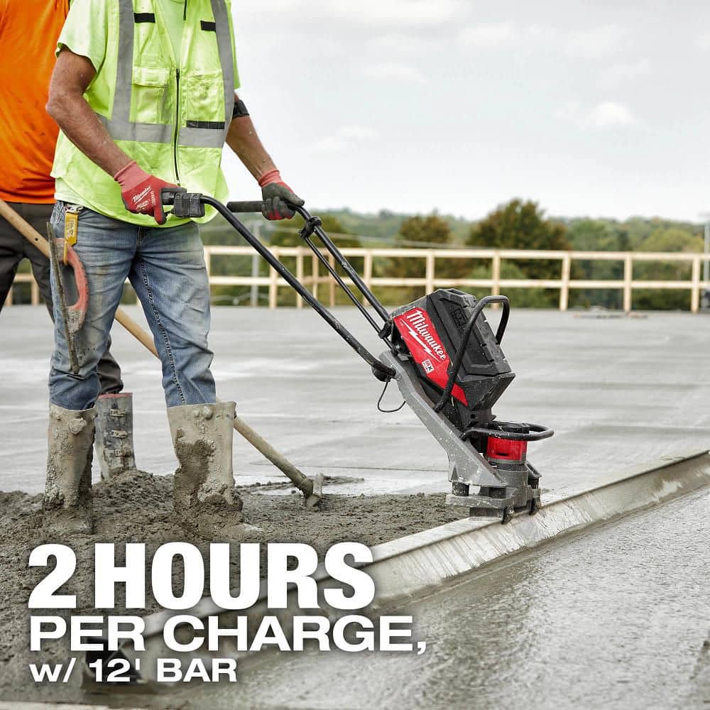 Milwaukee’s MX FUEL cordless vibratory screed delivers gas‑free power and push‑button starts for fast, reliable concrete finishing. The brushless motor provides up to 9,000 VPM and pulls bars up to 16 ft, while the REDLITHIUM CP203 batteries provide up to 2 hours of runtime with a 12 ft bar.