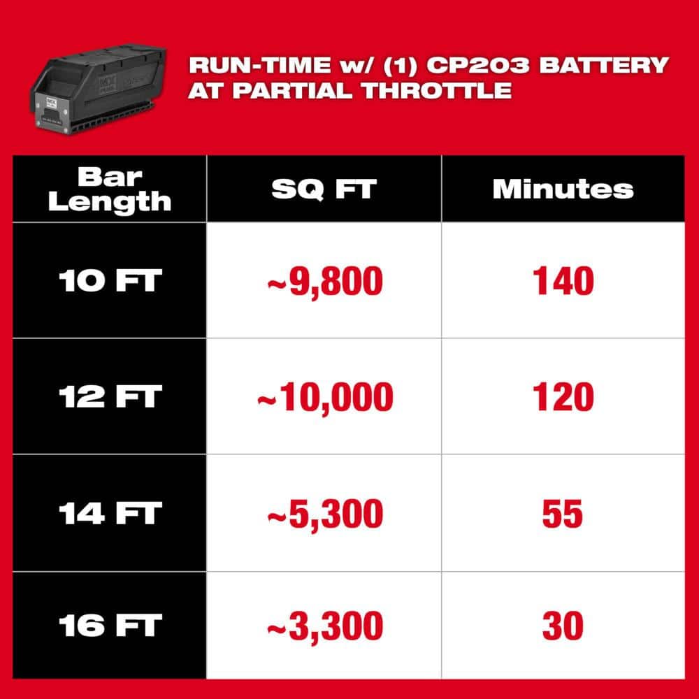 A: Up to 2 hours per charge with a 12 ft bar (typical conditions).