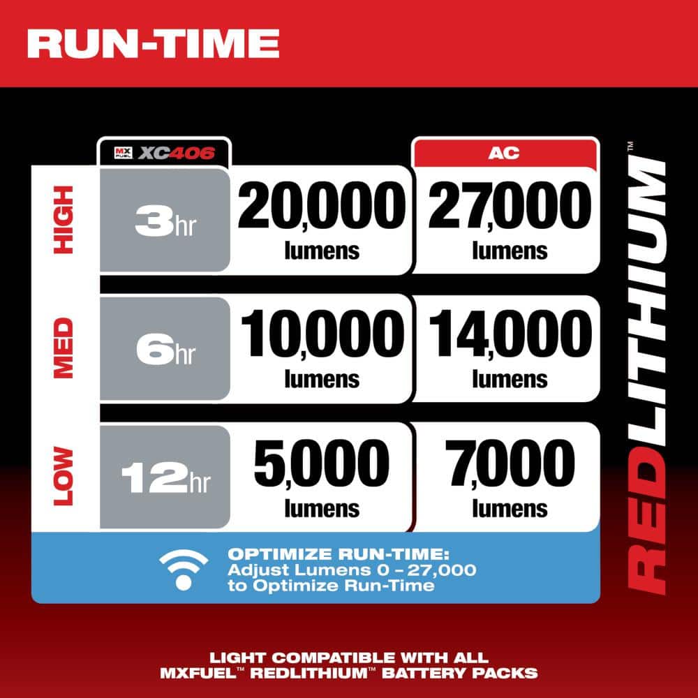 • High Output: Delivers 27,000 lumens with four adjustable light heads, powered by MX FUEL REDLITHIUM batteries.
