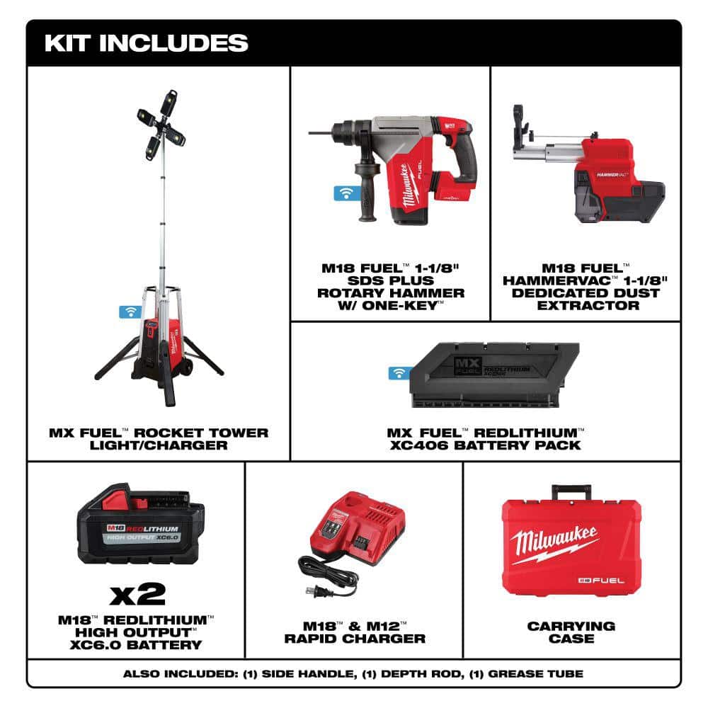 Milwaukee MX FUEL ROCKET Tower Light/Charger with M18 FUEL 1-1/8 in. SDS -Plus Rotary Hammer/Dust Extractor Kit