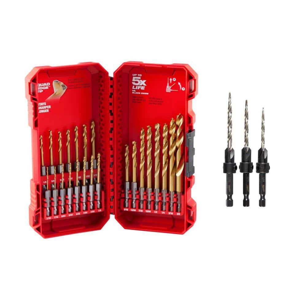 Engineered for impact-duty performance, this 26-piece Milwaukee SHOCKWAVE set pairs RED HELIX titanium-coated drill bits with #6/#8/#10 steel countersinks for fast, precise holes in wood, metal, and PVC. QUAD EDGE tips, a variable helix flute, and thicker tapered webs reduce heat and breakage while 1/4 in. hex shanks enable quick changes in drills and impact drivers.