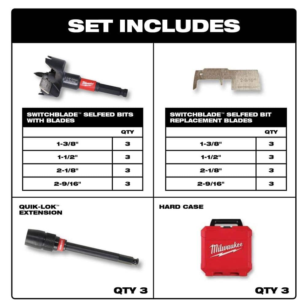 Milwaukee’s 15-piece SWITCHBLADE Selfeed Bit set delivers faster wood drilling and extended bit life for repetitive, large-hole applications. Replaceable hardened steel blades and an aggressive feed screw keep you drilling efficiently, while the impact-resistant case organizes bits and accessories.