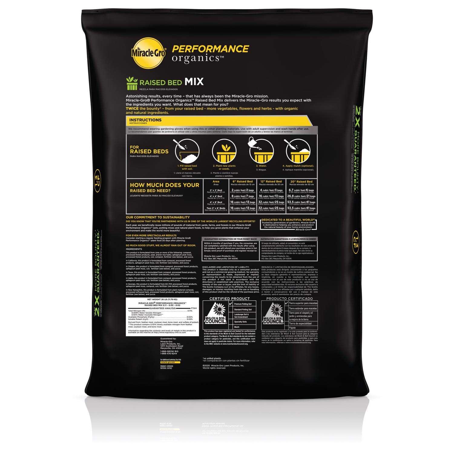 Miracle-Gro Performance Organics Raised Bed Mix delivers the Miracle-Gro results you expect with the ingredients you want. This organic soil is blended with aged compost and specifically formulated for raised bed gardens. To use, fill your raised bed with soil (see the How Much Does Your Raised Bed Need chart on the packaging), plant new plants or seeds, water and apply mulch (optional). With the natural and organic ingredients in Miracle-Gro Performance Organics Raised Bed Mix, you can grow more vegetables, flowers and herbs (vs. unfed plants).