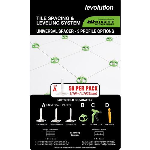 Levolution Tile Spacing and Leveling System is an innovative process for installing all tile on walls or floors Ideal for use with stone or tile up to 1/2 inch thick Universal spacers include parts for creation of tee, flat and cross spacers Spacers/anchors accommodate 3/16 inch grout joints Only one piece per intersection is needed, saving time and money Professional and DIY users can install evenly spaced and level tiles with ease Saves up to 51% in labor over other processes Use Cross (+) spacers for straight grid, Tee (T) for brick grid and Flat (-) for edges at walls