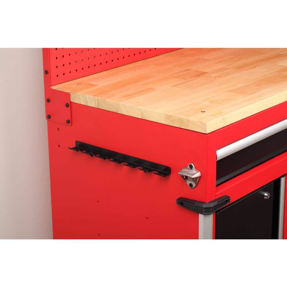This workbench anchors the garage with bold Milwaukee red and a beautifully grained wood top that invites hands-on craft. The soaring pegboard becomes a graphic backdrop, turning everyday tools into a curated display. Style it with matte-black bins and brushed steel hooks for a tailored, workshop-chic look. It’s the statement piece that delivers utility and luxury in equal measure.