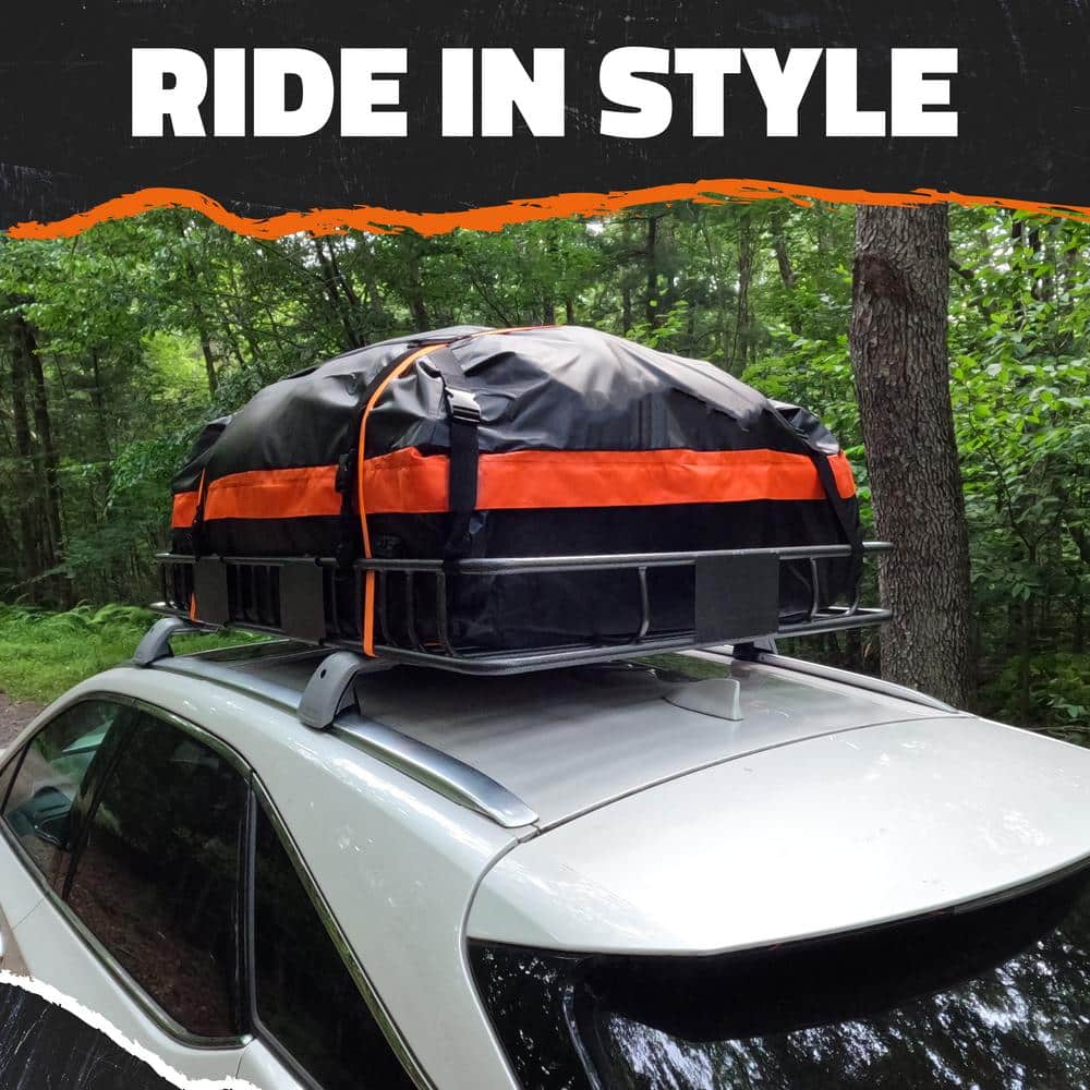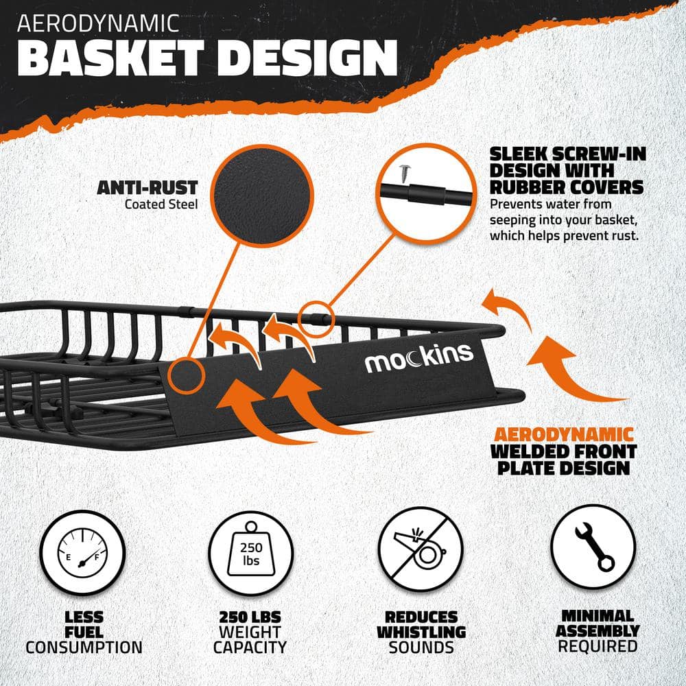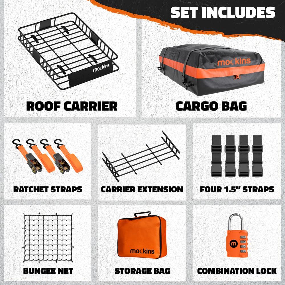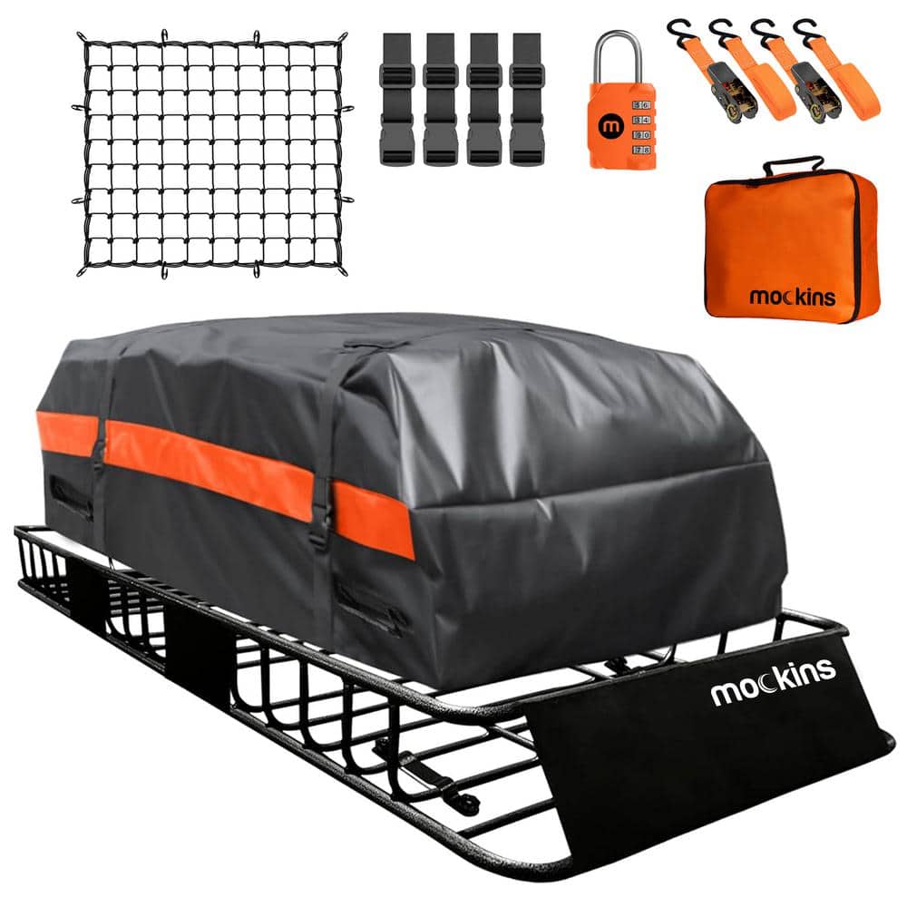 Elevate your travel experience with the Mockins 250 lbs. Roof Rack Basket featuring a 20 cubic feet weatherproof roof bag. Designed with heavy-duty steel and a rust-resistant coating, this roof cargo basket adjusts for customizable fit and streamlined travel.