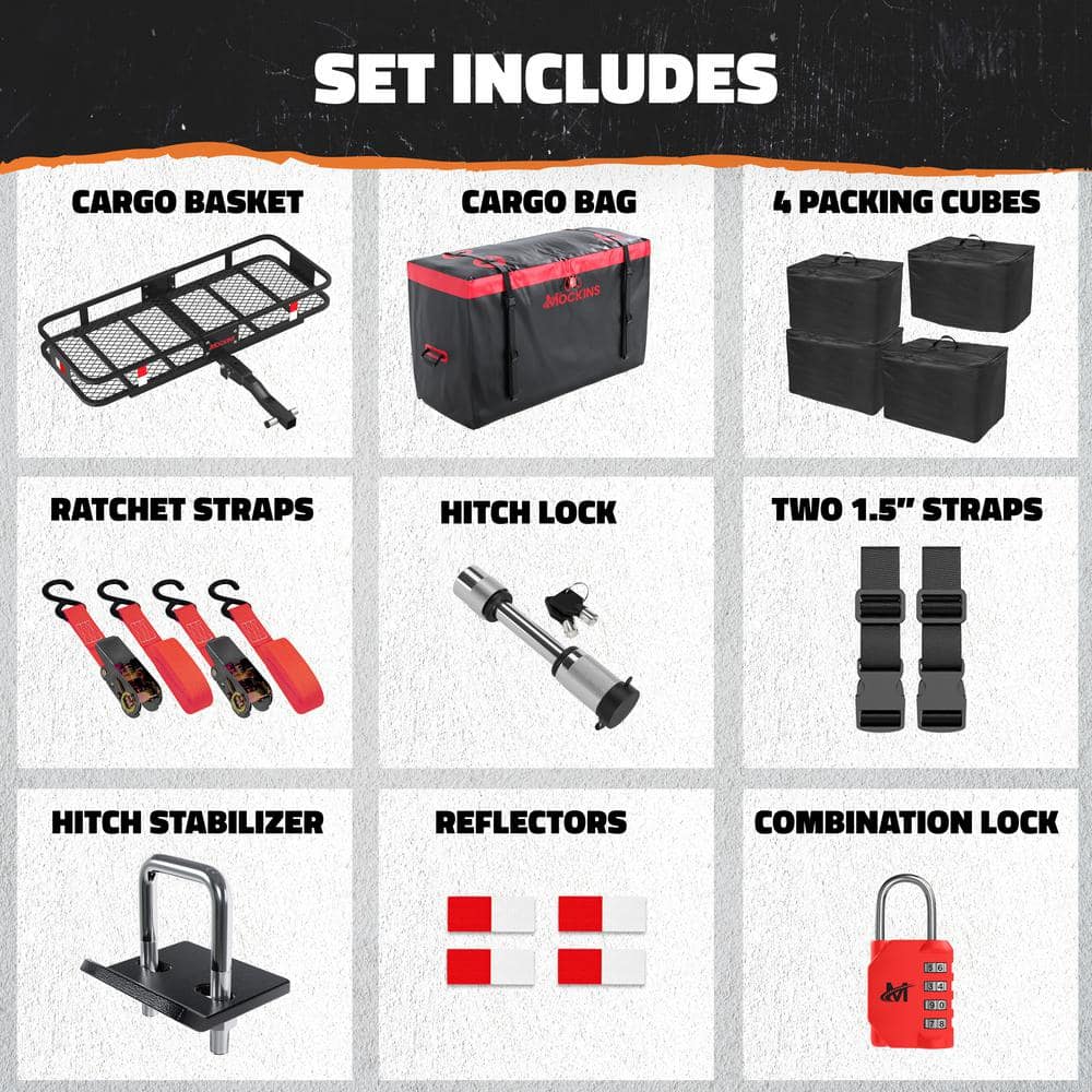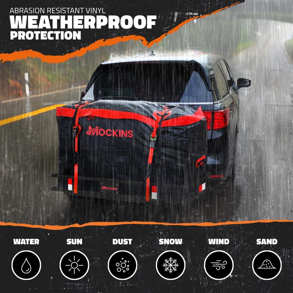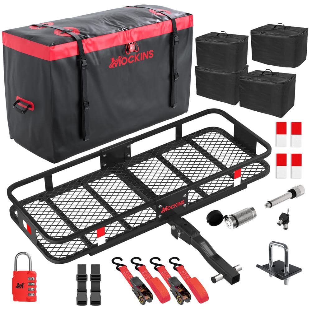 The Mockins Rustproof Hitch Mount Cargo Carrier, complete with a 15 cu. ft. waterproof cargo bag and four packing cubes, is the ultimate solution for transporting your gear without sacrificing vehicle space. Its robust construction holds up to 500 lbs., attaches to any 2 in. hitch receiver, and boasts rustproof steel for long-lasting performance.