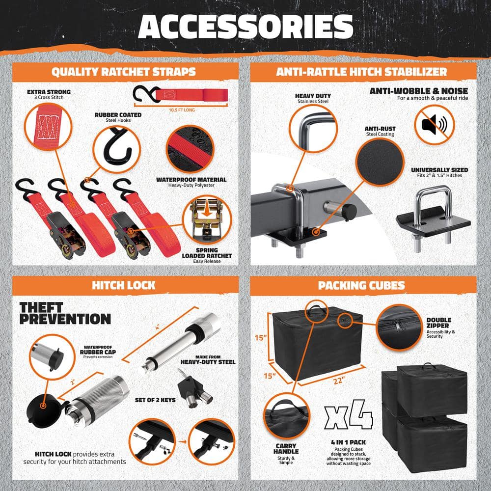 • Included Accessories: Comes with a waterproof cargo bag, packing cubes, hitch lock, ratchet straps, and stabilizer for complete transport security.