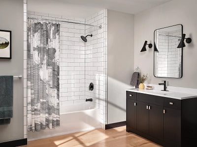 This Moen curved shower rod expands from 54 to 72 inches to fit standard 5-ft tubs and 72 x 72 in curtains, adding extra elbow room in the shower. Its matte black finish complements modern bathrooms and the corrosion-resistant construction ensures lasting performance.