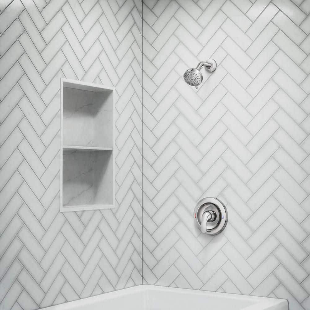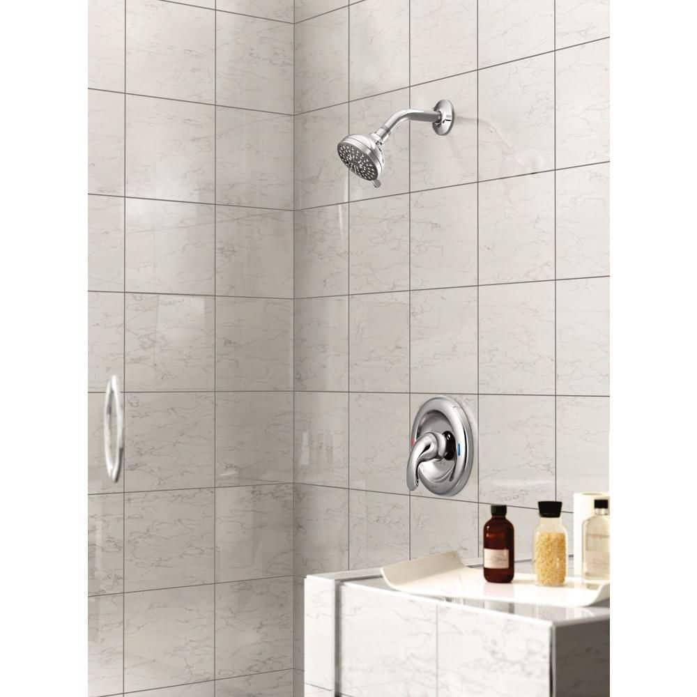 This MOEN Adler shower faucet delivers dependable performance and classic style. The 4-function showerhead provides versatile spray options while the included Posi-Temp pressure-balancing valve maintains consistent temperature and pressure. A durable chrome finish and self-cleaning nozzles make it a practical, long-lasting choice for everyday showers.