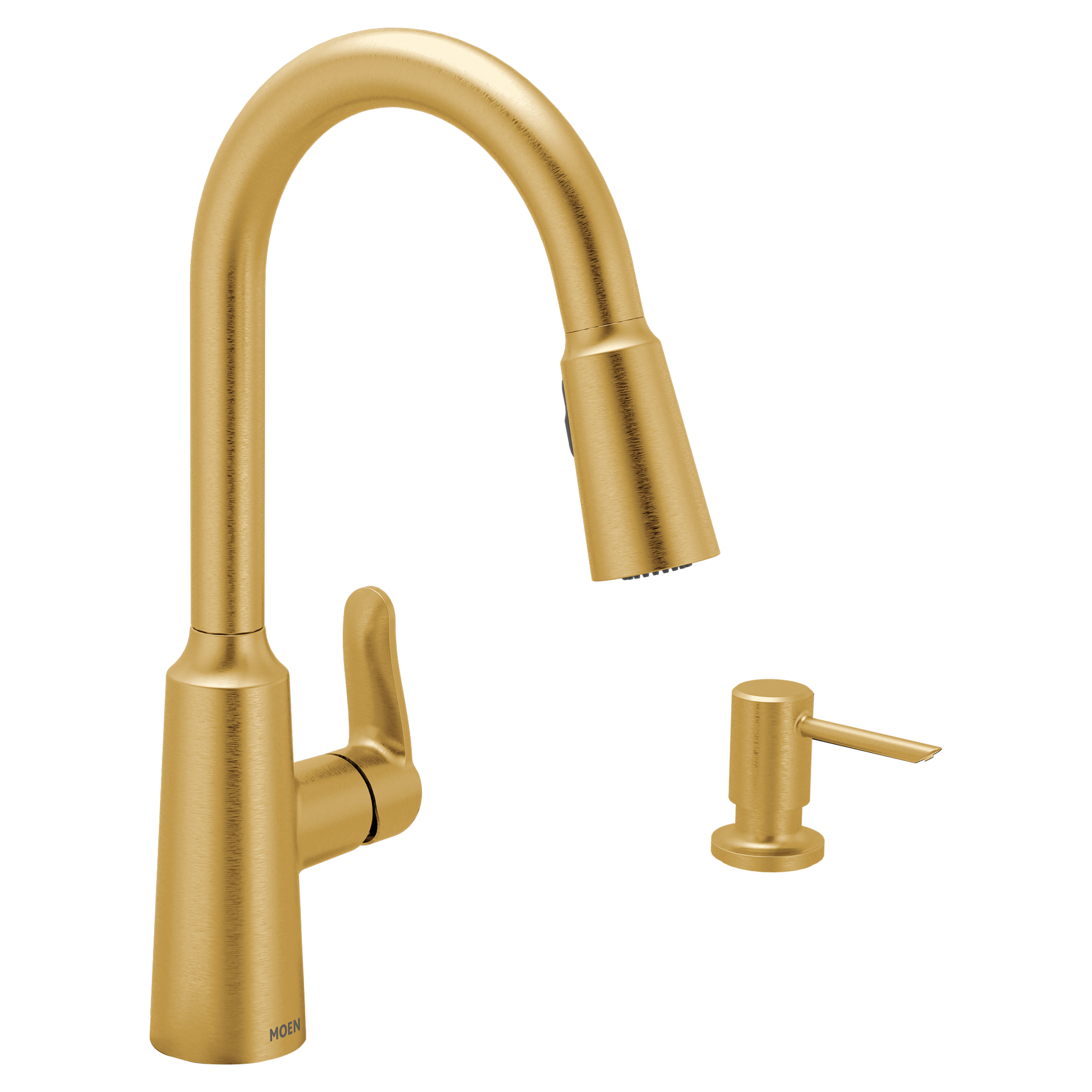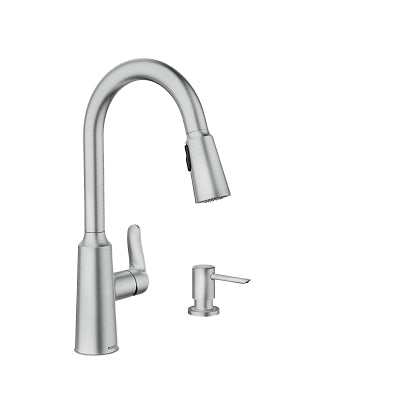 Moen Edwyn Spot Resist Stainless 1‑Handle High Arc Pull‑Down Kitchen Faucet with Deck Plate and Soap Dispenser, Commercial/Residential
