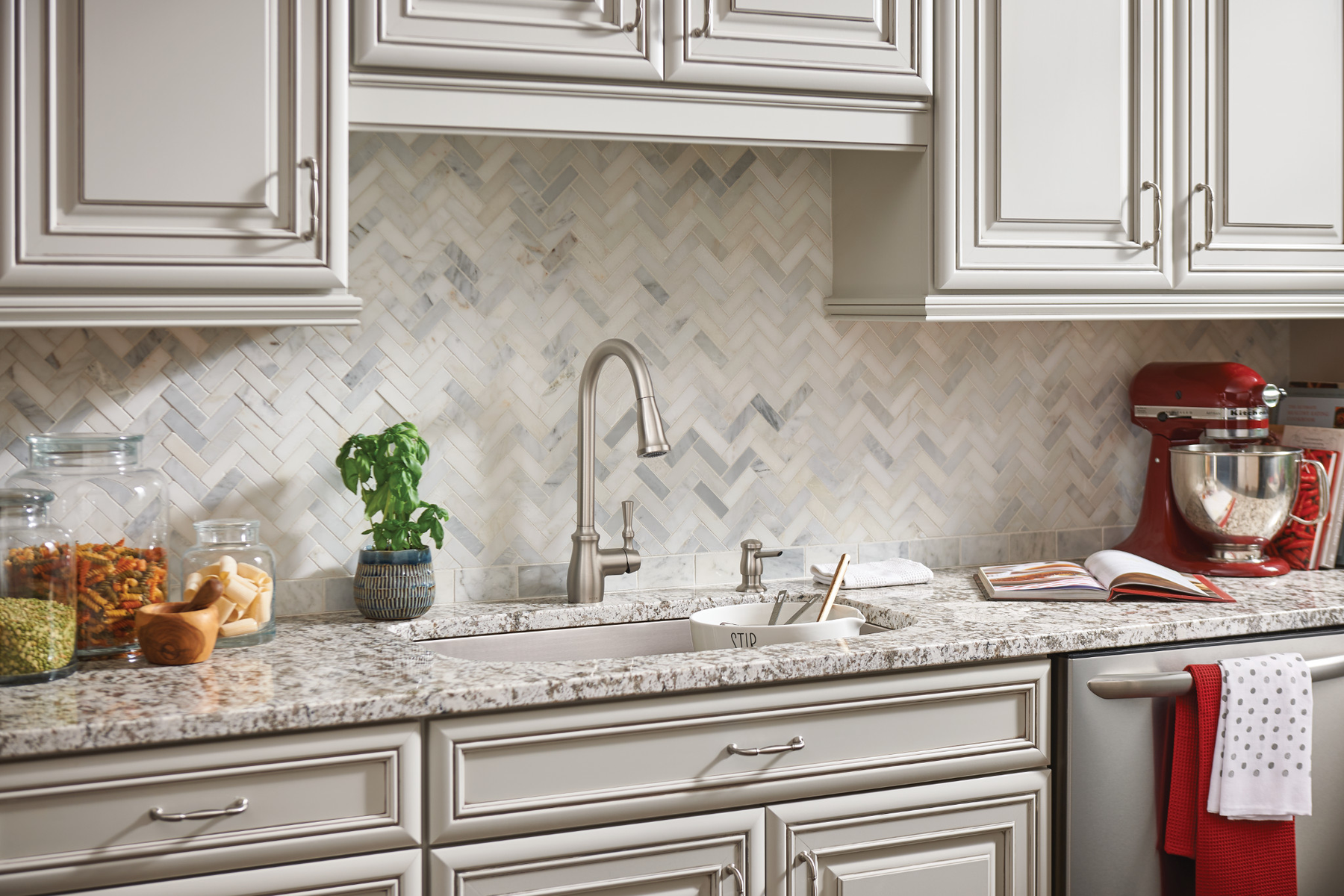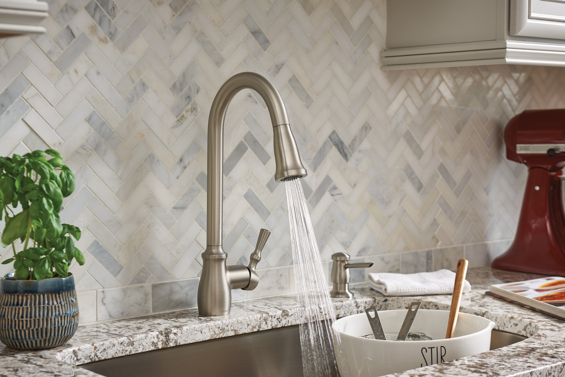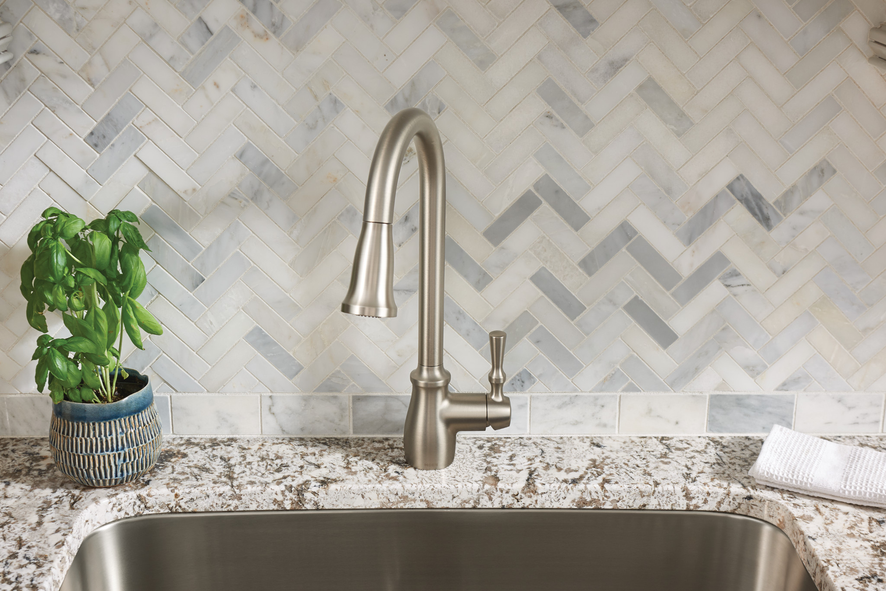 Fieldstone’s high arc silhouette brings a tailored elegance to the kitchen, striking a balance of tradition and modernity. The Spot Resist Stainless finish quietly gleams, anchoring the space with timeless sophistication. Style it with a herringbone marble backsplash to echo its graceful curves, and let the pull-down spray head add a note of functional luxury. It’s a polished essential for kitchens that live beautifully.