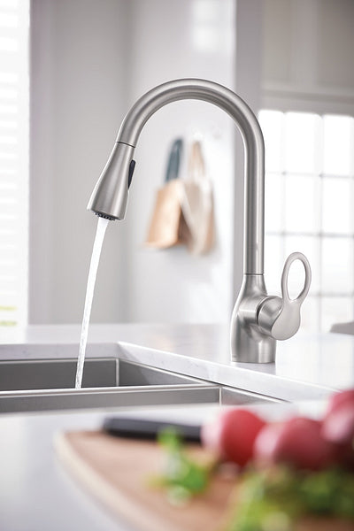 Kleo’s sculpted high arc and looped handle bring a graceful, modern gesture to the kitchen. The Spot Resist Stainless finish offers a quiet luster that stays pristine, while the streamlined pull-down wand keeps the silhouette clean. Pair it with crisp white quartz and matte black accents for a chic, effortless mix. It’s a refined essential that elevates daily rituals into a little luxury.