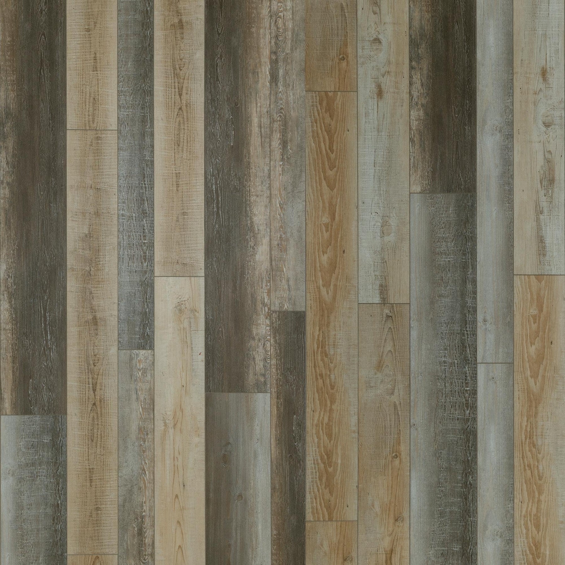 Premium rigid LVP in a weathered Sahara Pine look with multi-width planks for a custom, designer floor. Waterproof construction with interlocking installation and built-in underlayment makes it durable and DIY-friendly for any room.
