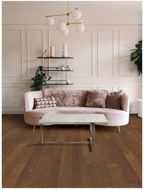This engineered maple brings a delicious, hand‑worked texture that anchors a space with quiet sophistication. The 5‑inch planks and ultra‑matte finish read modern yet timeless, letting furnishings shine while adding a layer of warmth underfoot. Pair it with blush upholstery and brass accents to amplify its honeyed glow, or contrast with sculptural black pieces for drama. It’s a luxurious foundation—effortless, resilient, and endlessly stylish.