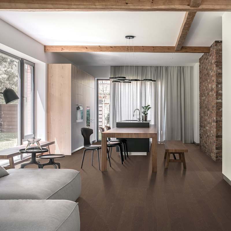 This engineered birch brings a rich, cafe-toned warmth that grounds the room with effortless sophistication. The handscraped surface catches the light beautifully, adding movement and artisanal texture underfoot. Pair it with matte-black accents and linen drapery to let the grain’s natural swirls sing. It’s a refined foundation that instantly elevates everyday living.