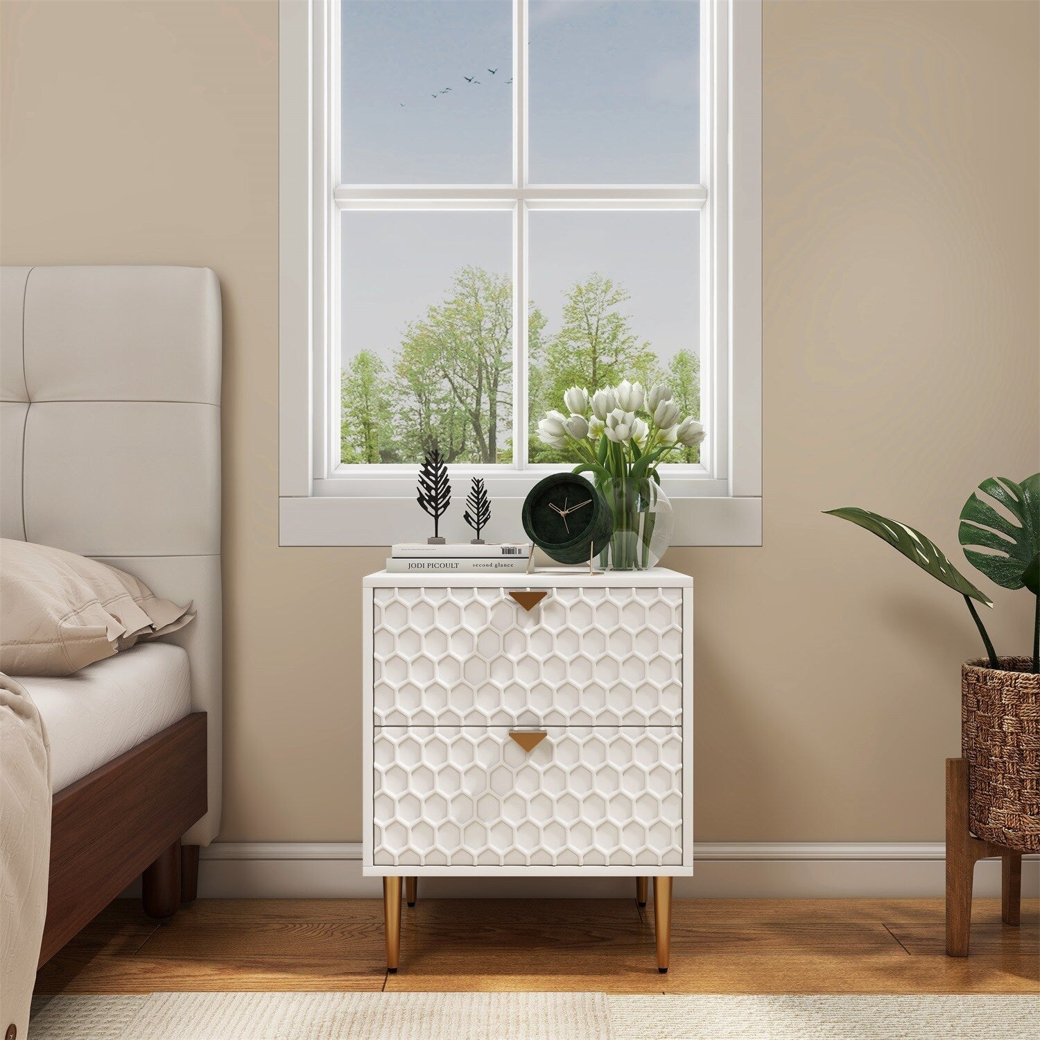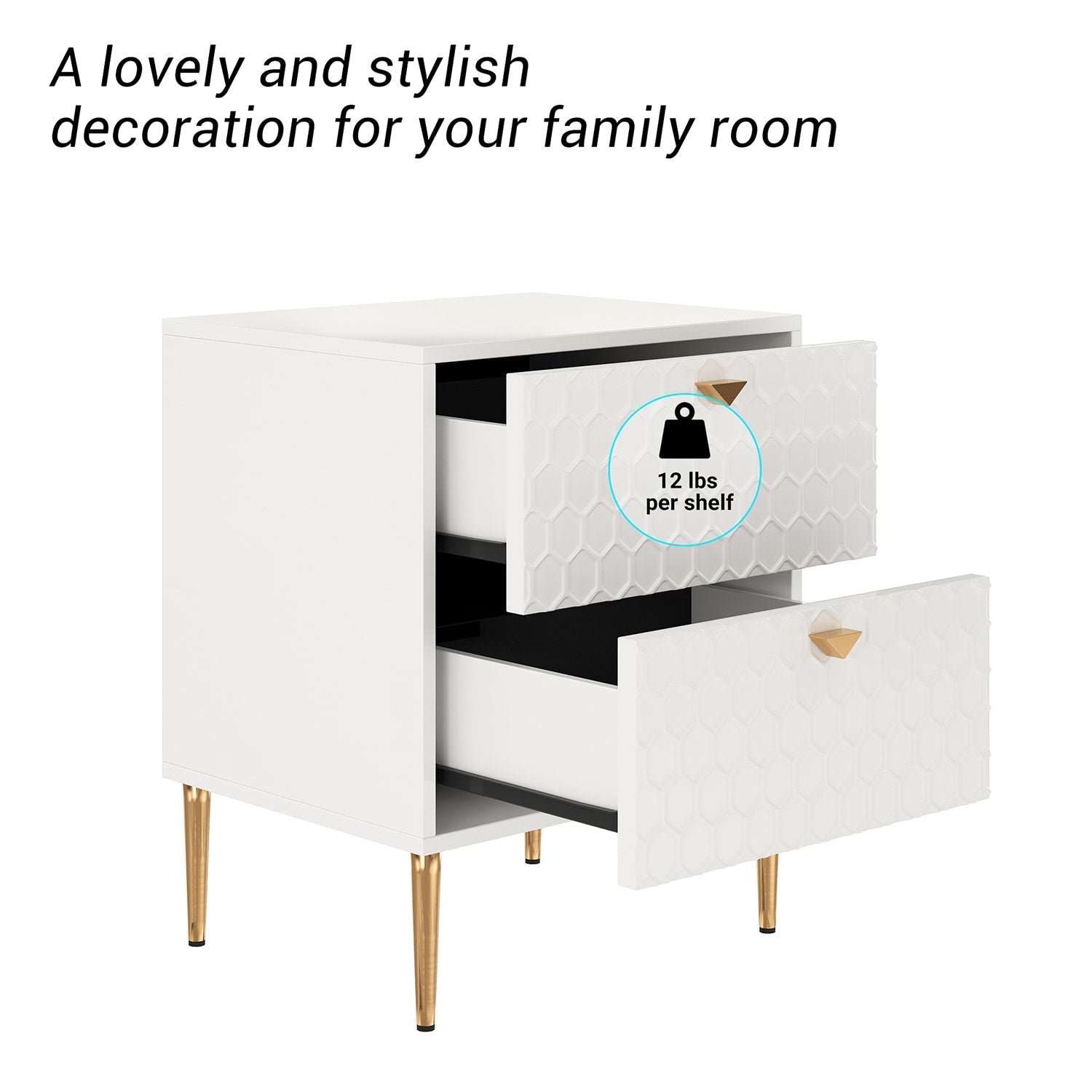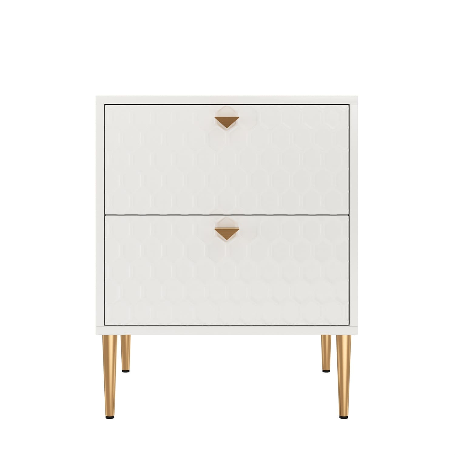 Elevate your space with the Mondawe White 2-Drawer Cabinet Chest, a versatile storage solution with a touch of elegance. Featuring a stylish 3D embossed design and gold accent legs, this cabinet is perfect for organizing your essentials in any room. Easy to assemble, it brings a chic yet functional element to modern interiors.