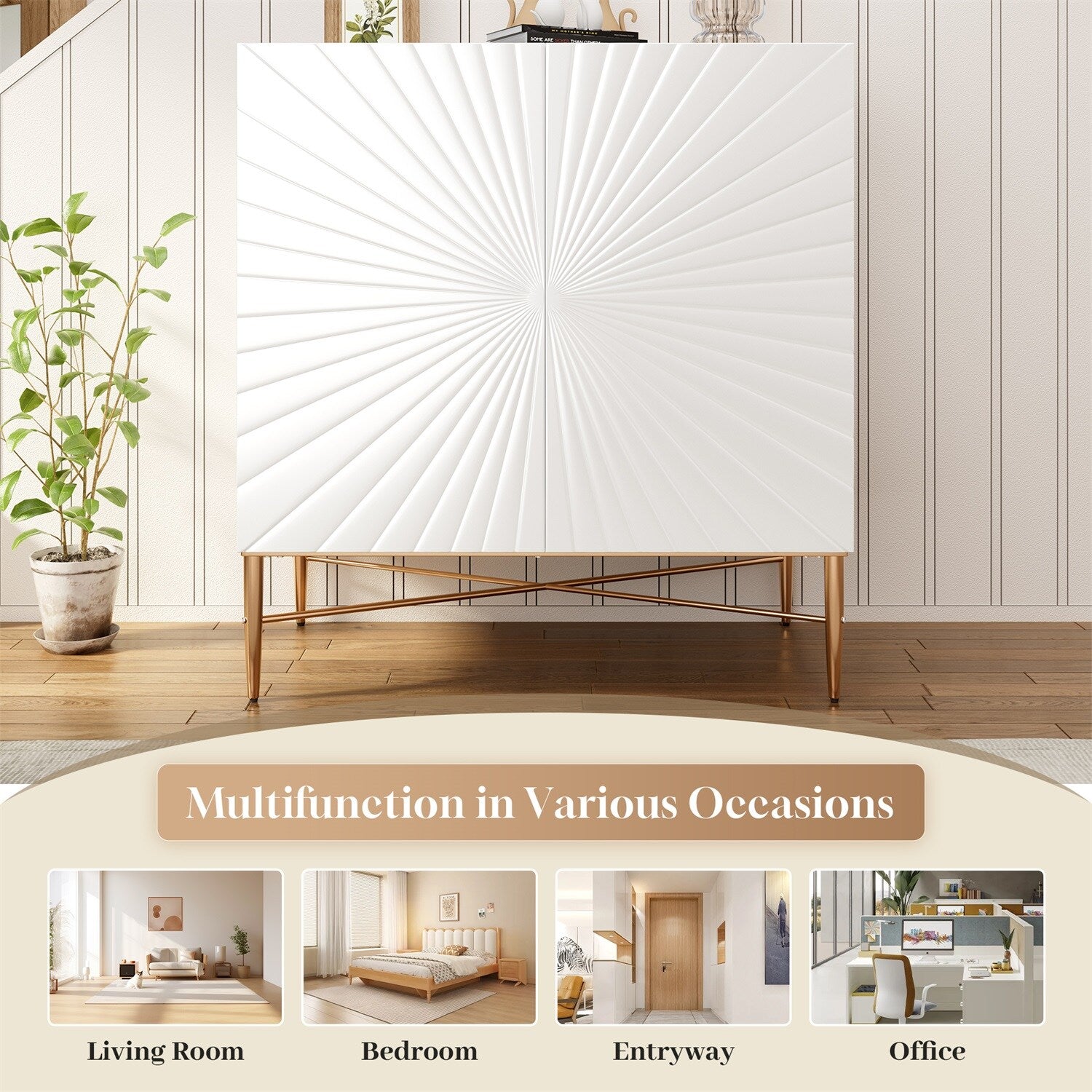 Unveil a world of style with the Mondawe Modern Accent Cabinet—a masterpiece that seamlessly transforms mundane storage with its artistic flair. The striking hand-carved geometric design stands out as a bold statement piece, perfect for any room seeking sophistication. Use it in a dining room to artfully display fine dinnerware or in an entryway to warmly welcome guests. This cabinet embodies the fusion of aesthetic grace and functional brilliance, essential for any luxurious ambiance.