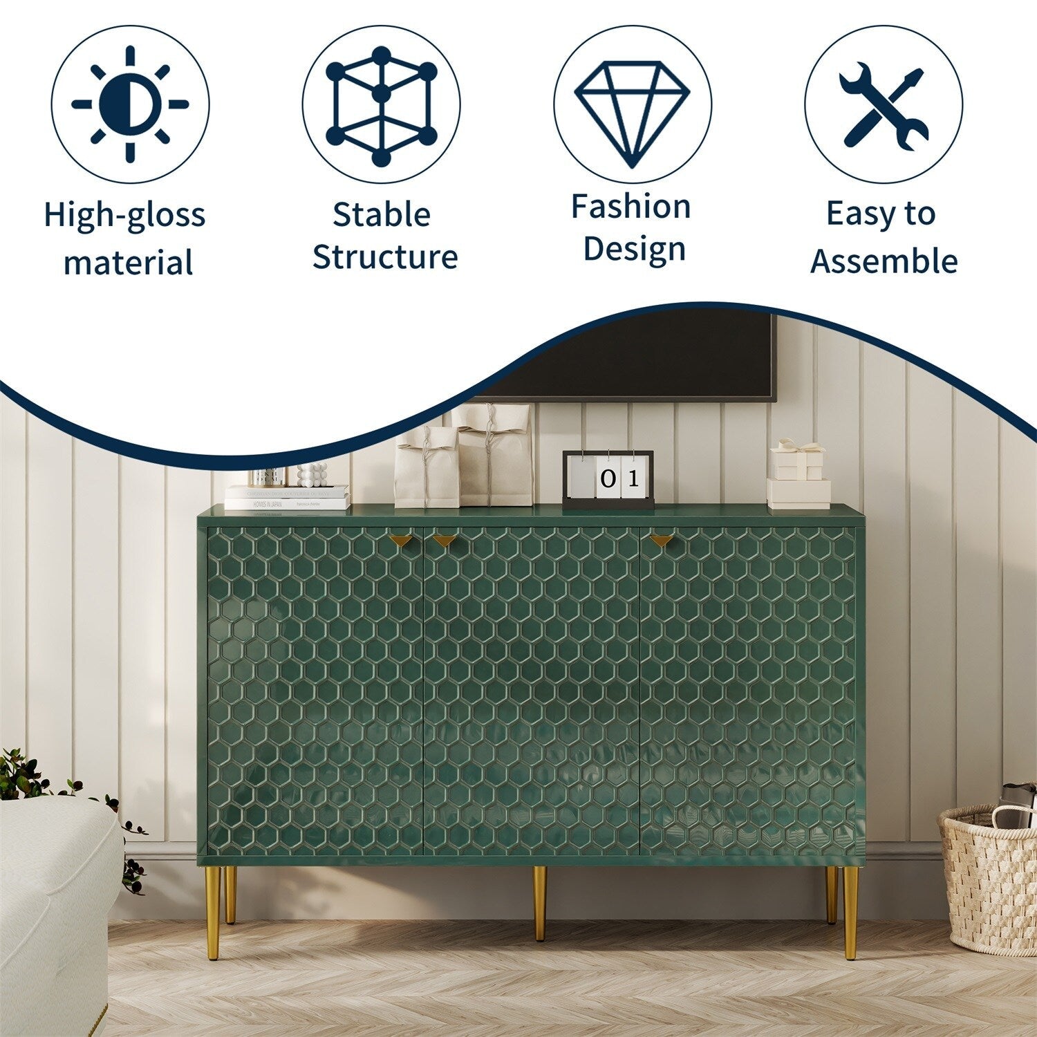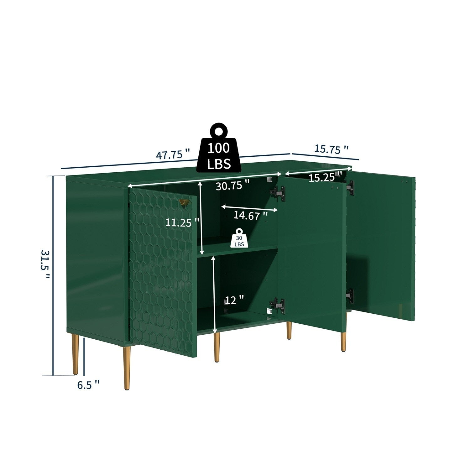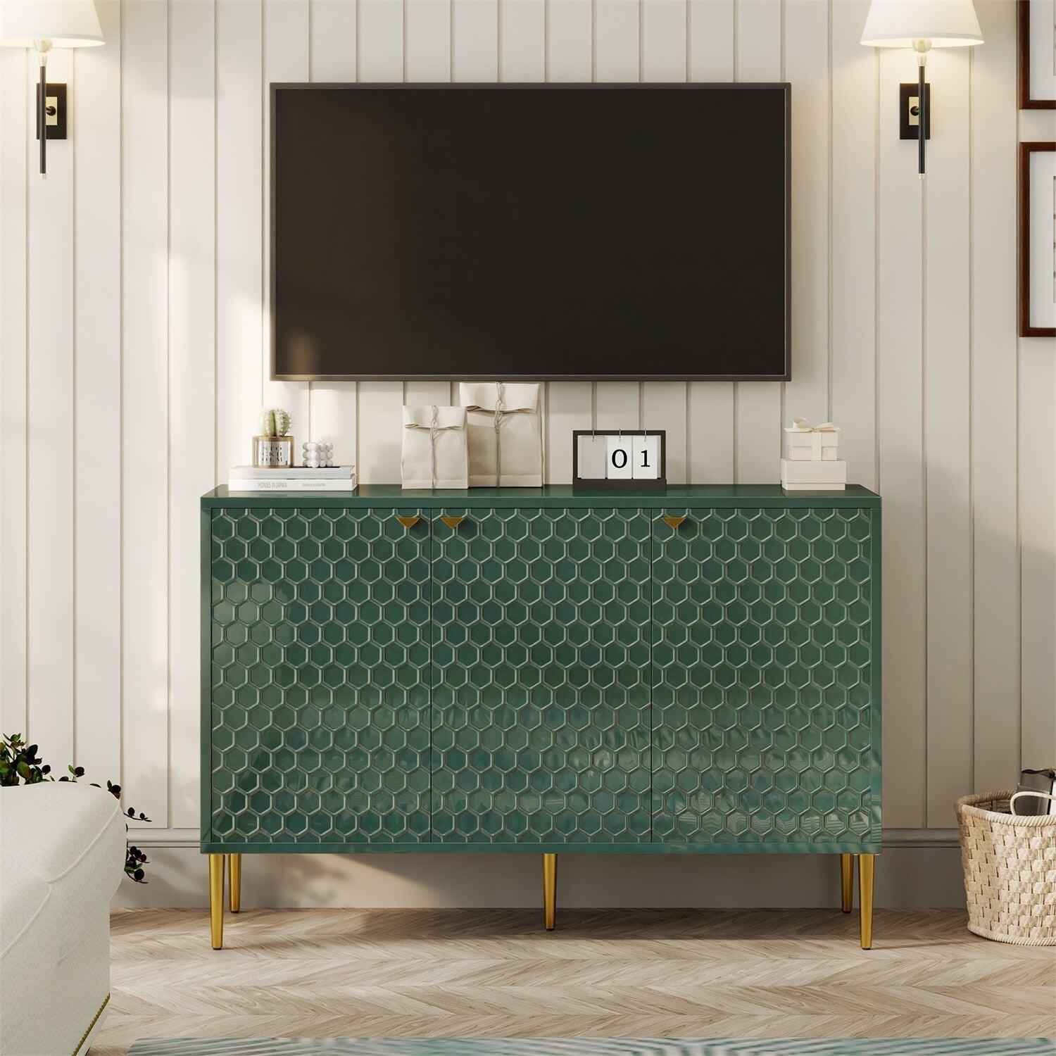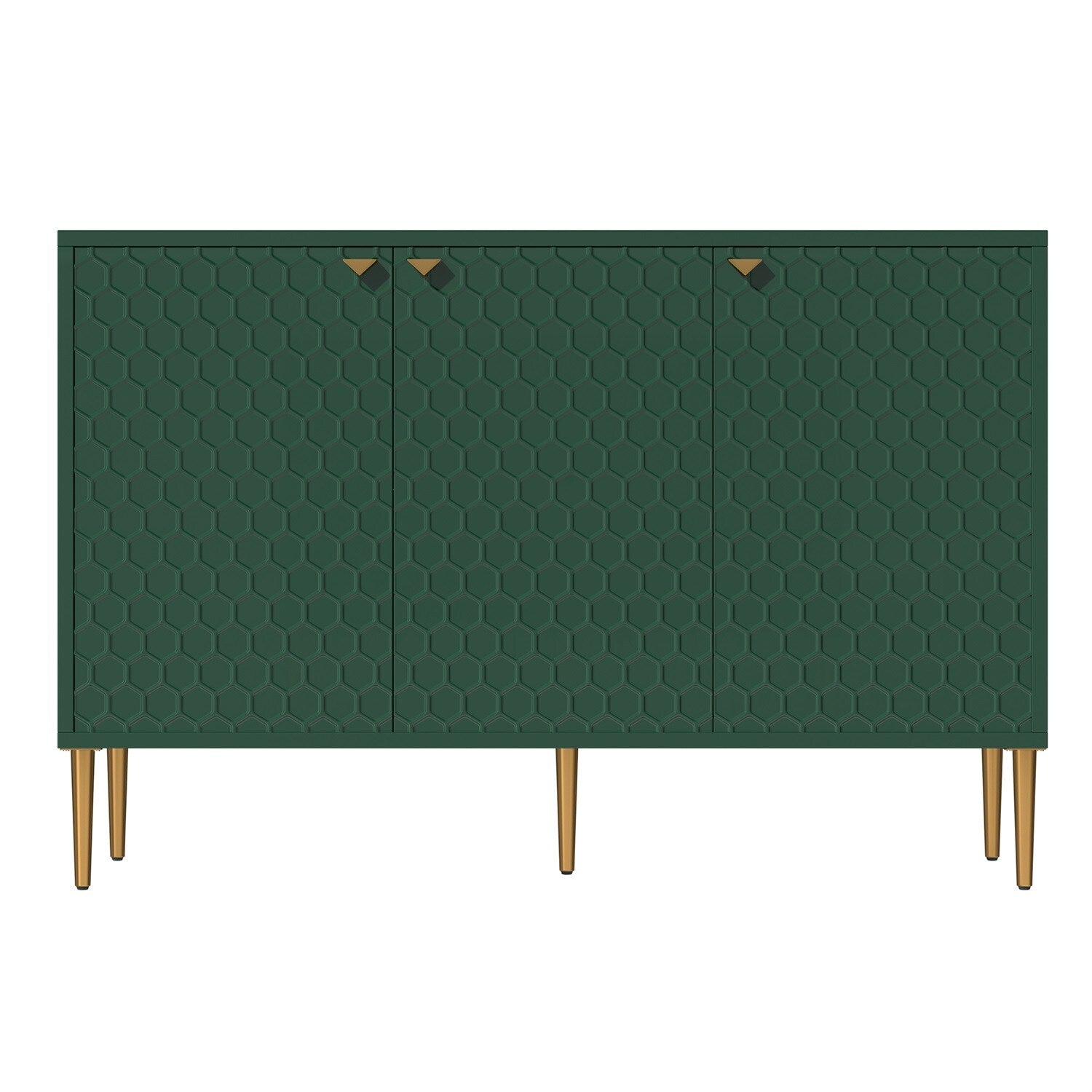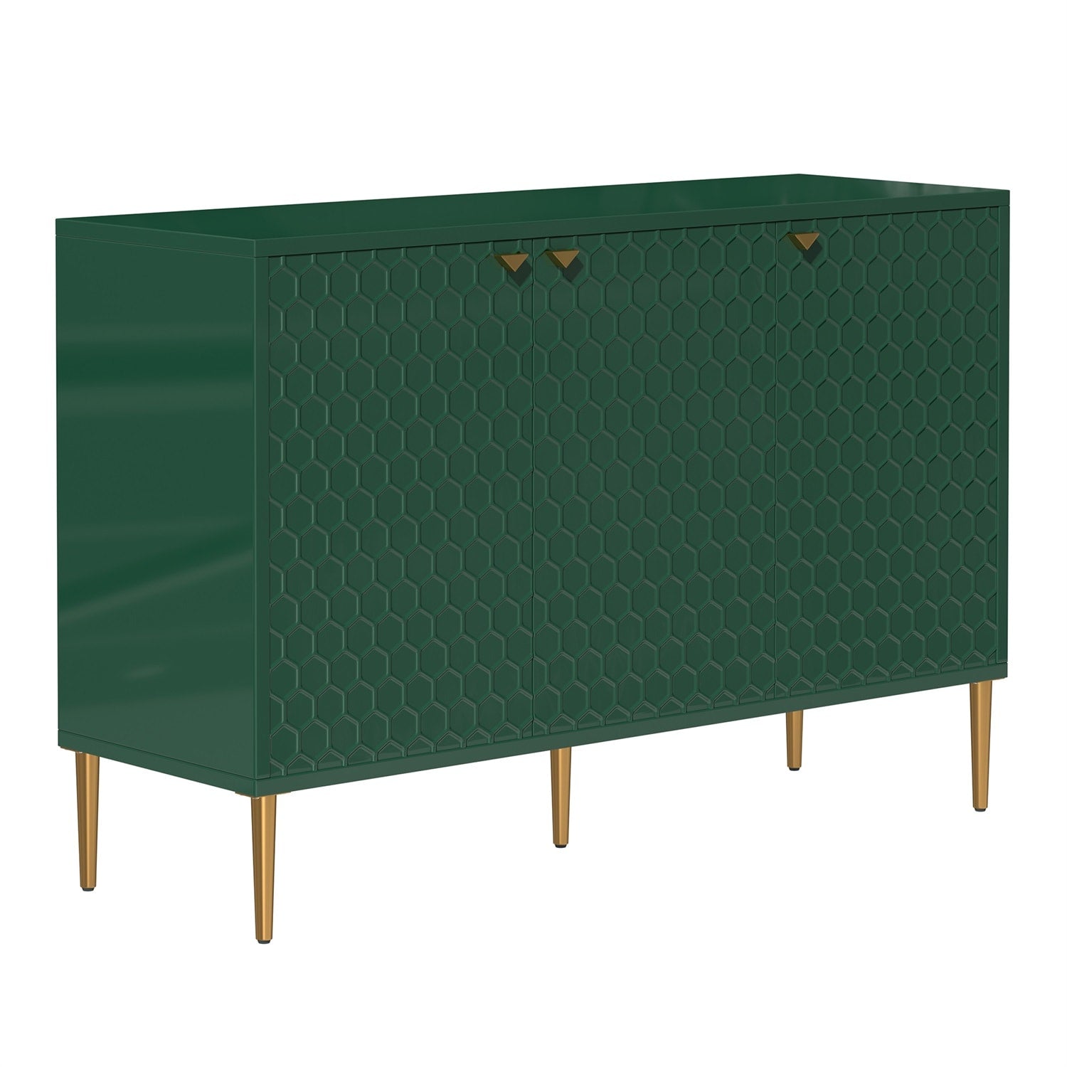 Imagine the Mondawe 3-Door Accent Cabinet gracing your home with its vibrant green hue and chic golden accents. Its raised honeycomb pattern adds a layer of visual intrigue, making it a show-stopping focal point in any room. Consider placing it in your living area to neatly conceal everyday essentials while adding a splash of color. This cabinet is more than storage—it's a touch of luxury that elevates your space into something truly special.