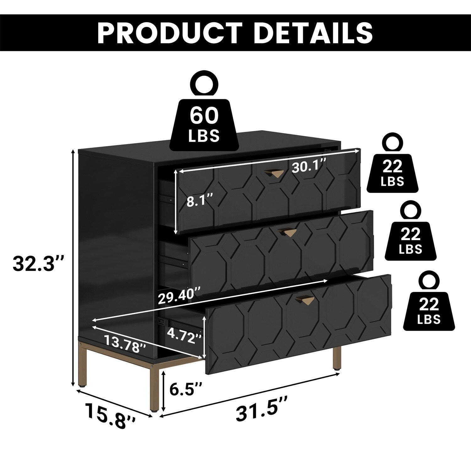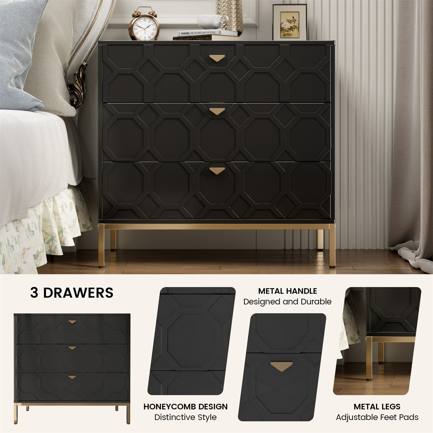 Elevate your home's storage solutions with the Mondawe 31.5 inch 3-Drawer Cabinet in sleek black. Featuring exquisite tapered gold-colored legs and a chic honeycomb design, this piece combines utility with modern elegance, making it perfect for contemporary settings.