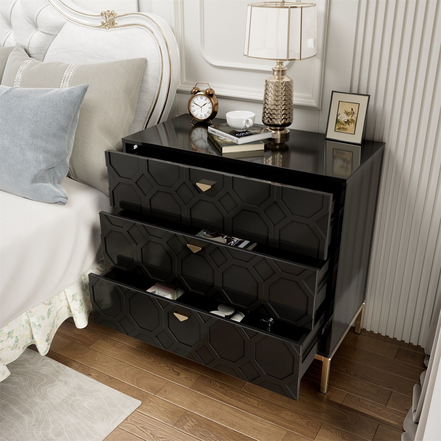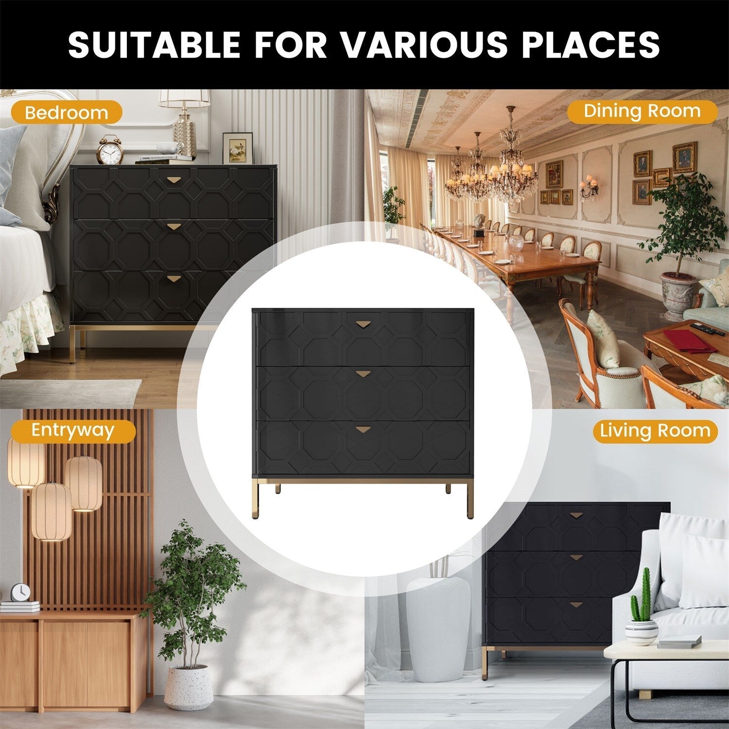 The Mondawe Black 3-Drawer Cabinet transcends ordinary storage, turning spaces into showcases of style and function. Its refined black finish and gold accented legs subtly echo luxury, while the innovative honeycomb detailing creates a captivating focal point. Envision this piece in a minimalist living area or a chic office, providing both utility and sculptural beauty. Embrace its design as an embodiment of sophisticated simplicity, essential for the modern, elegant home.