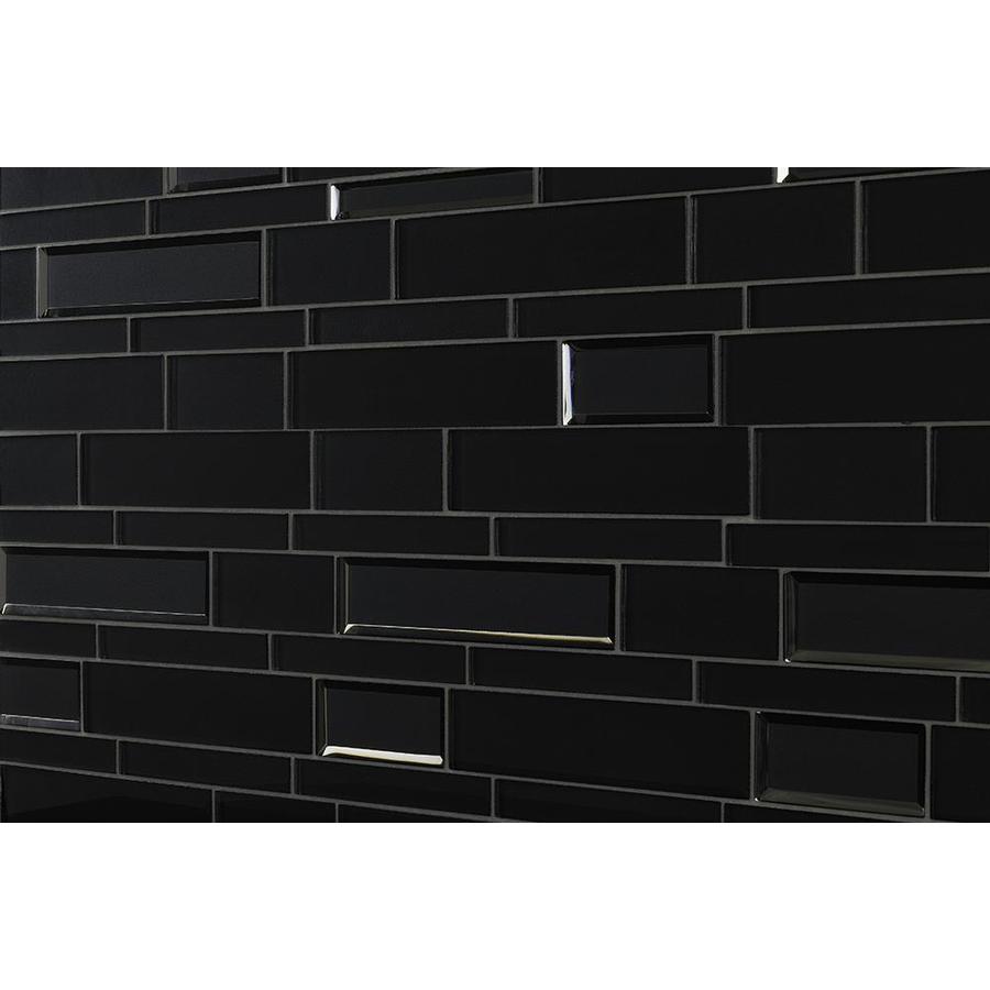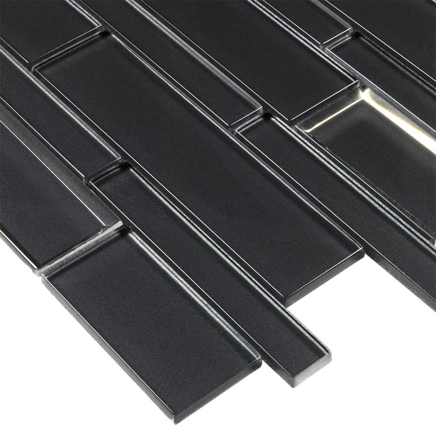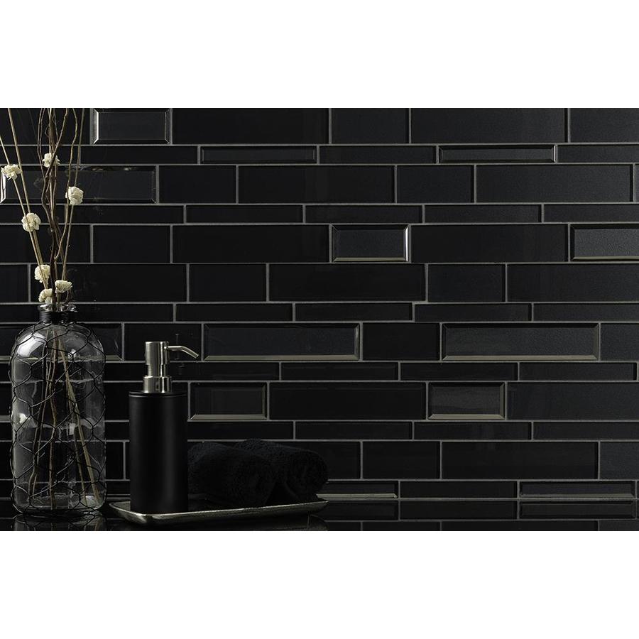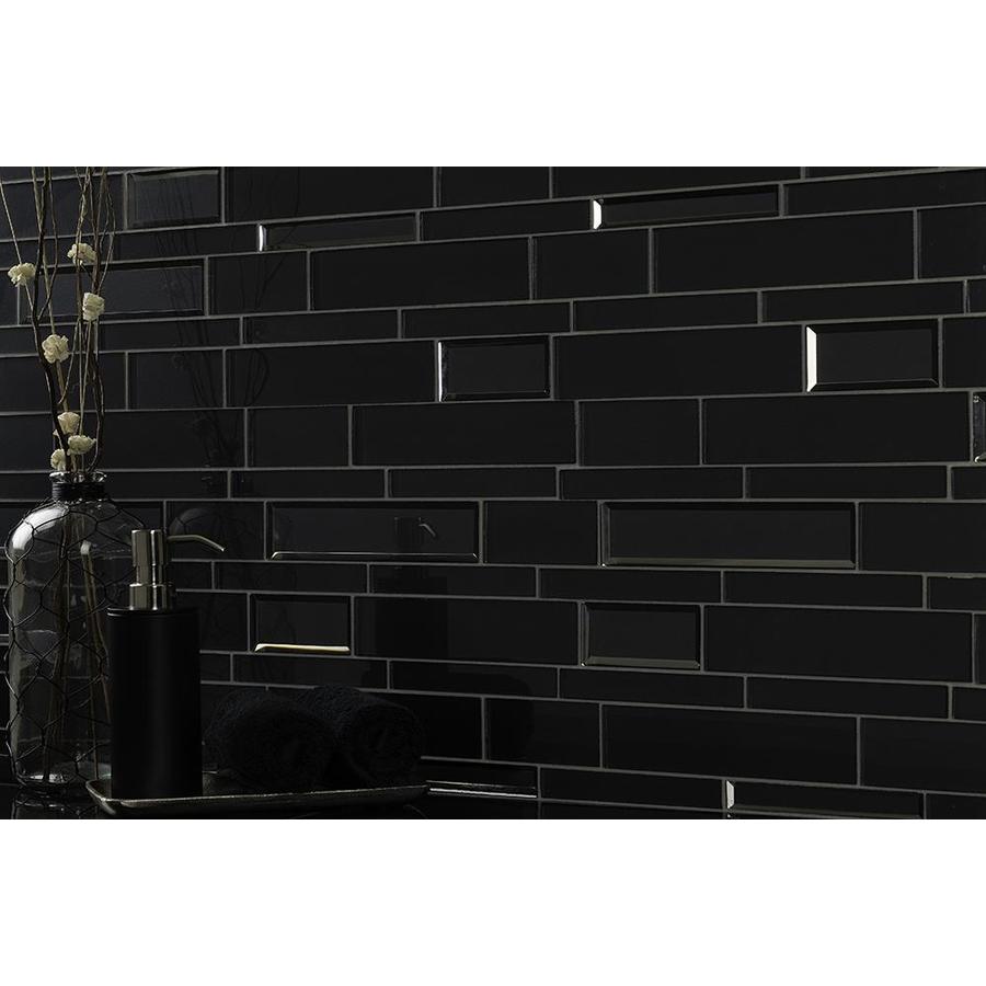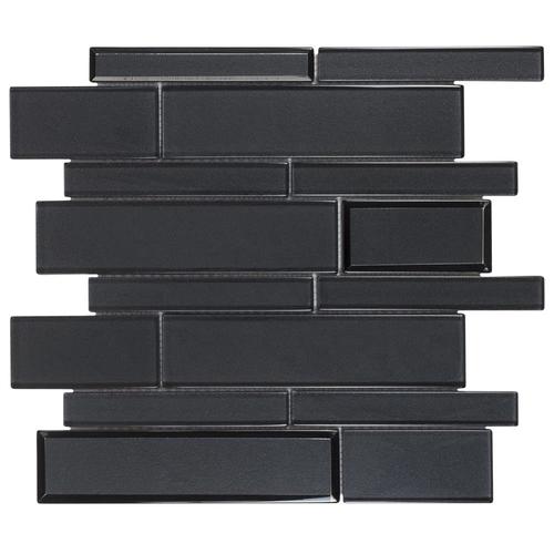 Sleek black glass mosaic tile with a glossy, mirrored-bevel mix adds modern drama to backsplashes and feature walls. Impervious and waterproof, the 11.75-in x 11.75-in mesh-mounted sheet installs easily with thinset for kitchens, baths, and showers.