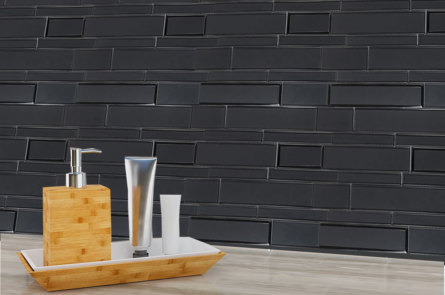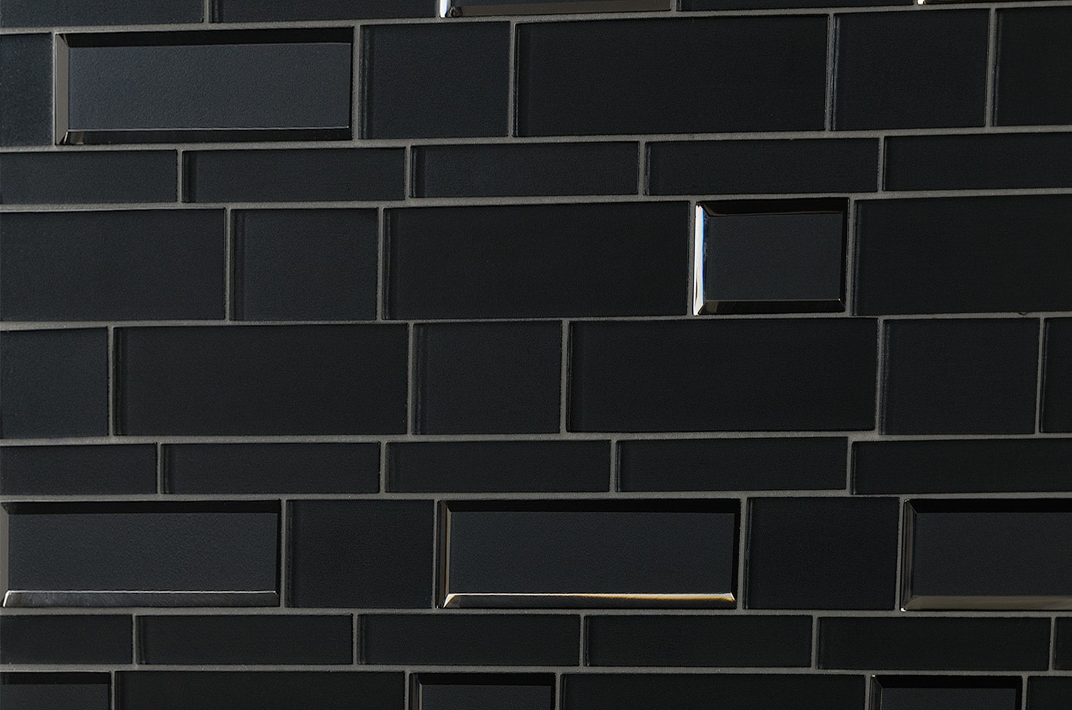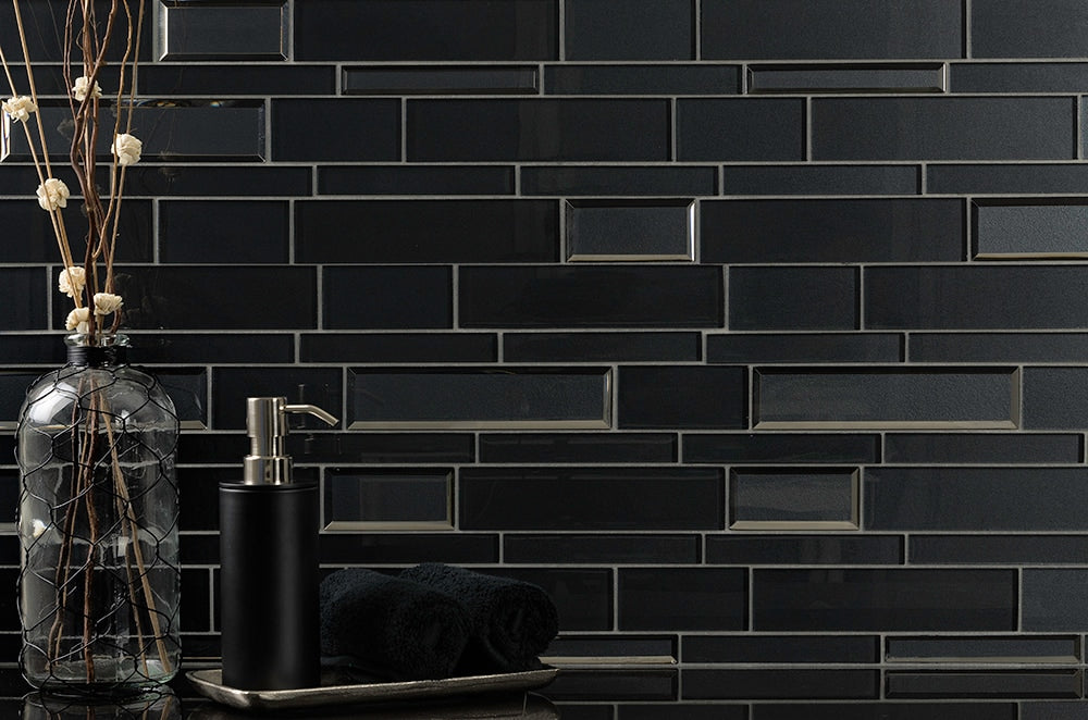 • Modern Glass Mosaic: Shimmery black linear pieces with mirrored bevel accents for a high-end look.