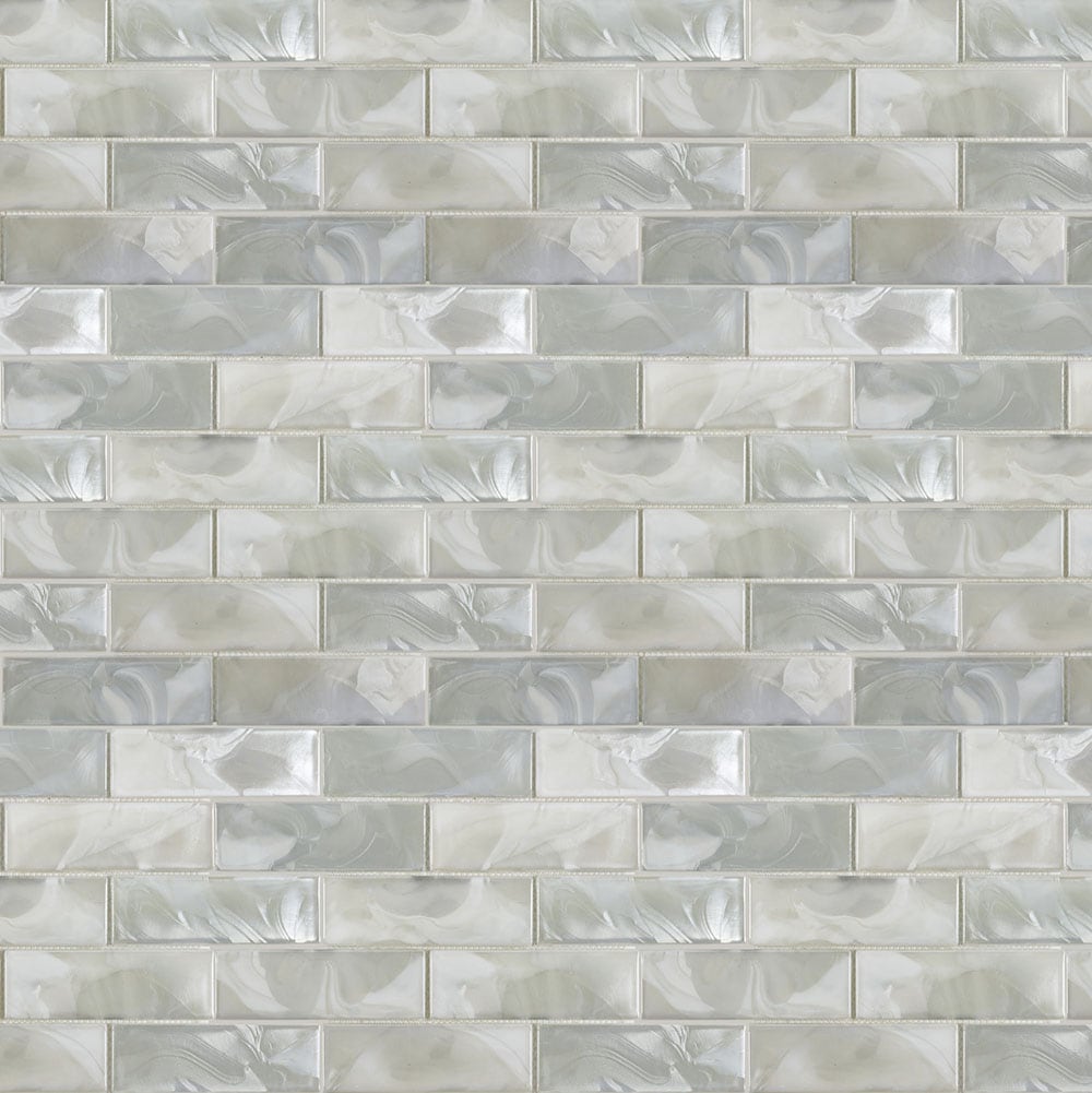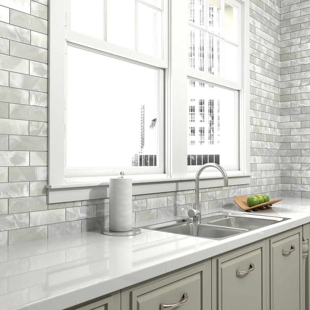 This mosaic whispers luxury with a pearly, translucent sheen that catches light like water. The elongated brick pattern adds rhythm and refinement, elevating even the simplest backsplash. Pair it with soft gray cabinetry and matte nickel fixtures to let the glass glow. It’s an effortless path to a polished, spa-worthy space.