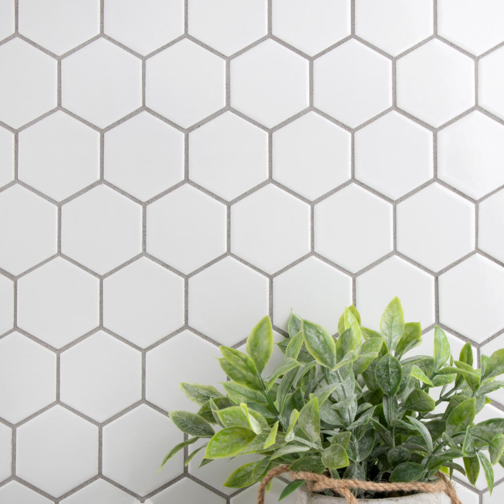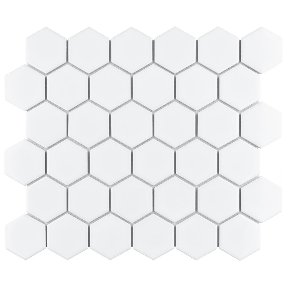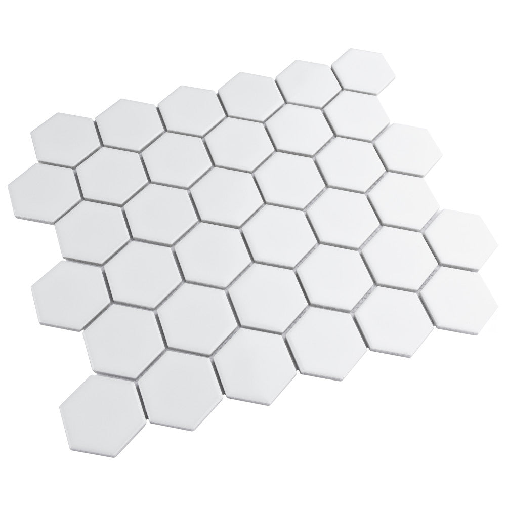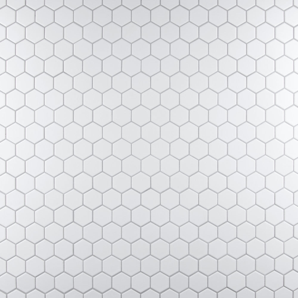 Classic hexagon porcelain mosaic on mesh backing for clean, timeless surfaces. Glossy, high-sheen finish with impervious, frost-resistant porcelain suits floors and walls in baths, kitchens, showers, and even pools. Each 11-1/8 in. x 12-5/8 in. sheet installs easily to create a seamless honeycomb pattern.
