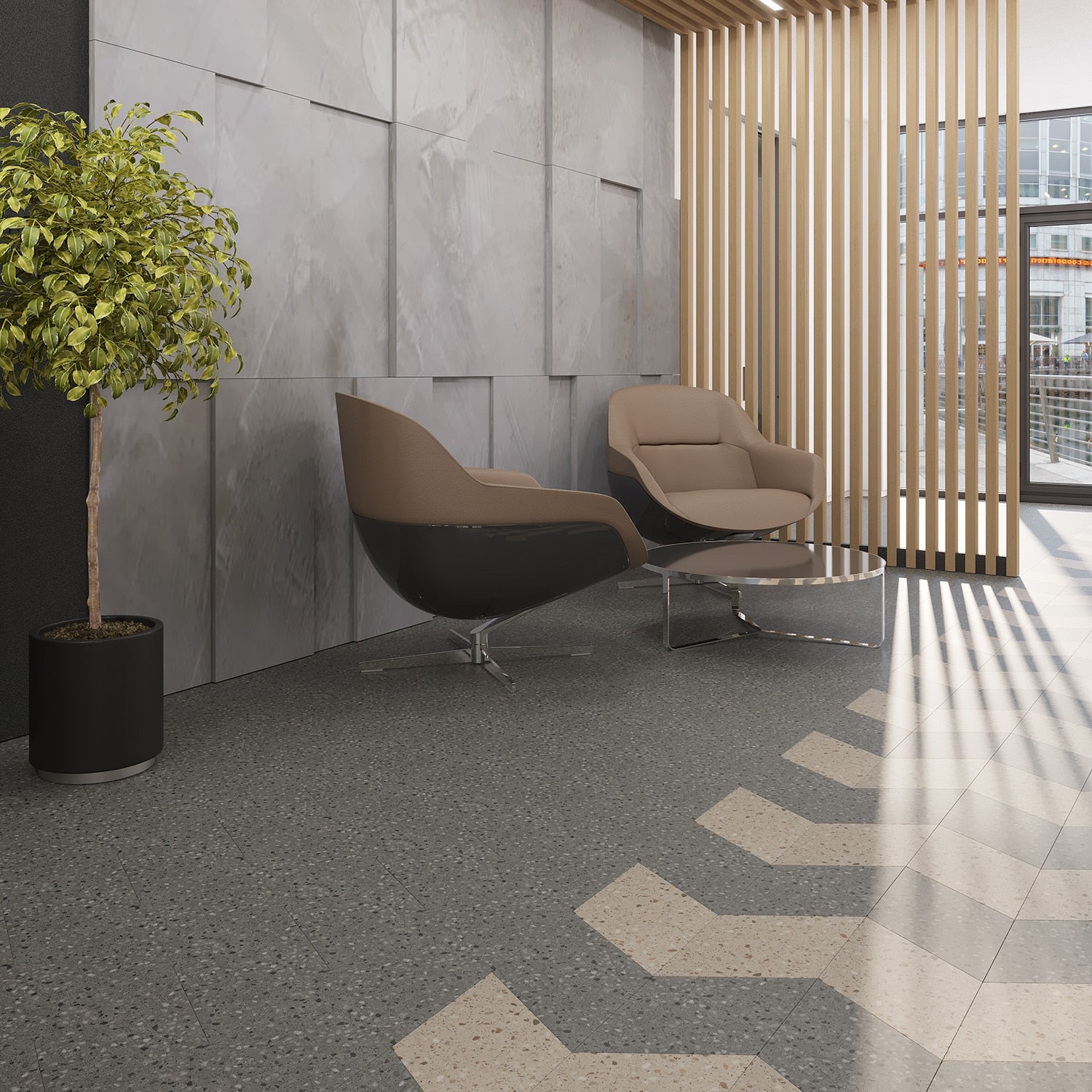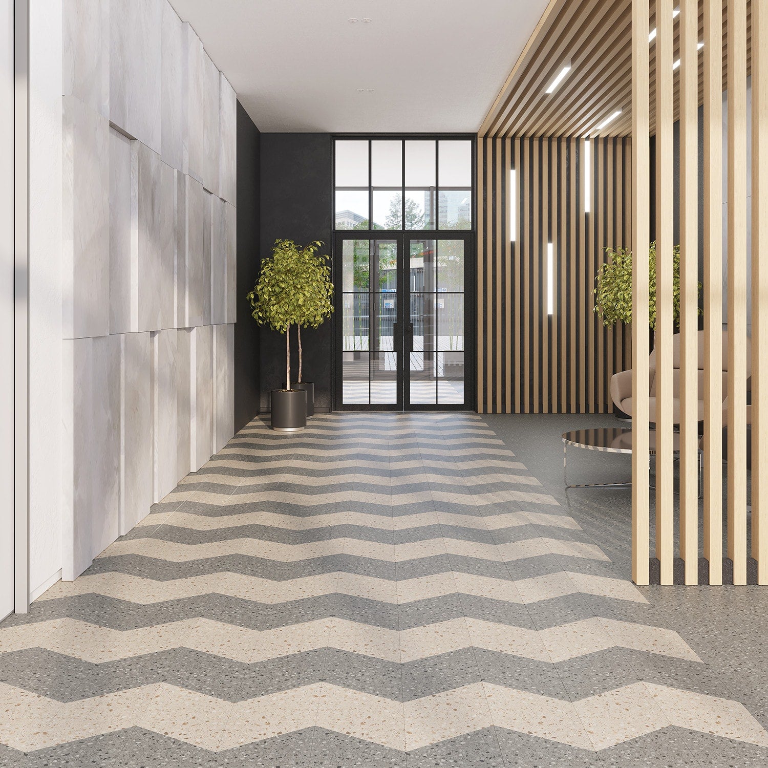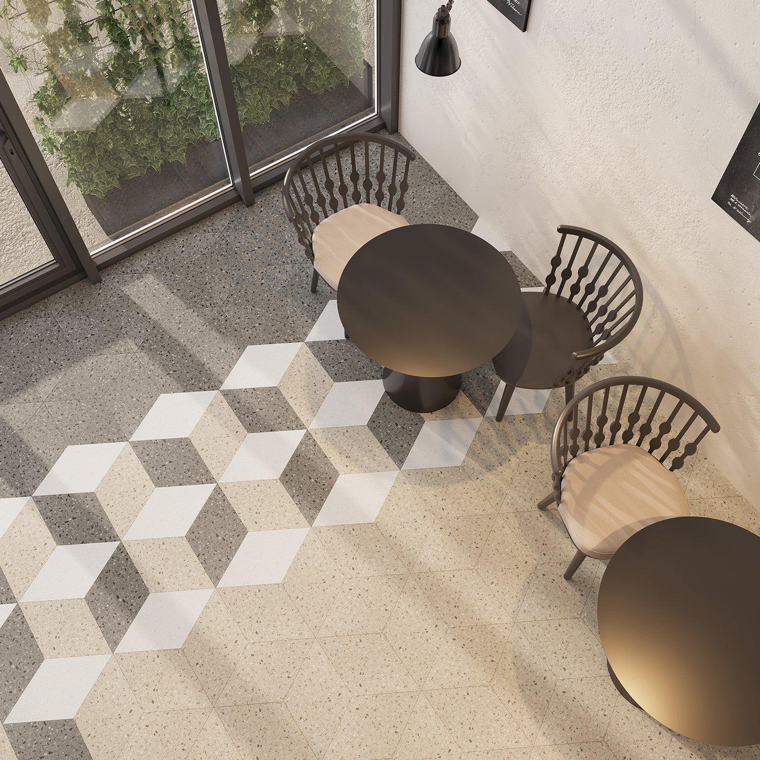 MosaiCore Alpine Rock captures the cool sophistication of terrazzo with a rhythmic, geometric pulse. The rhombus format invites playful 3D cubes and chevrons that shift with the light—a striking gesture in lobbies or modern kitchens. Pair it with pale woods and matte black metals to let the pattern sing with quiet authority. It’s a refined foundation that delivers luxury and longevity in equal measure.
