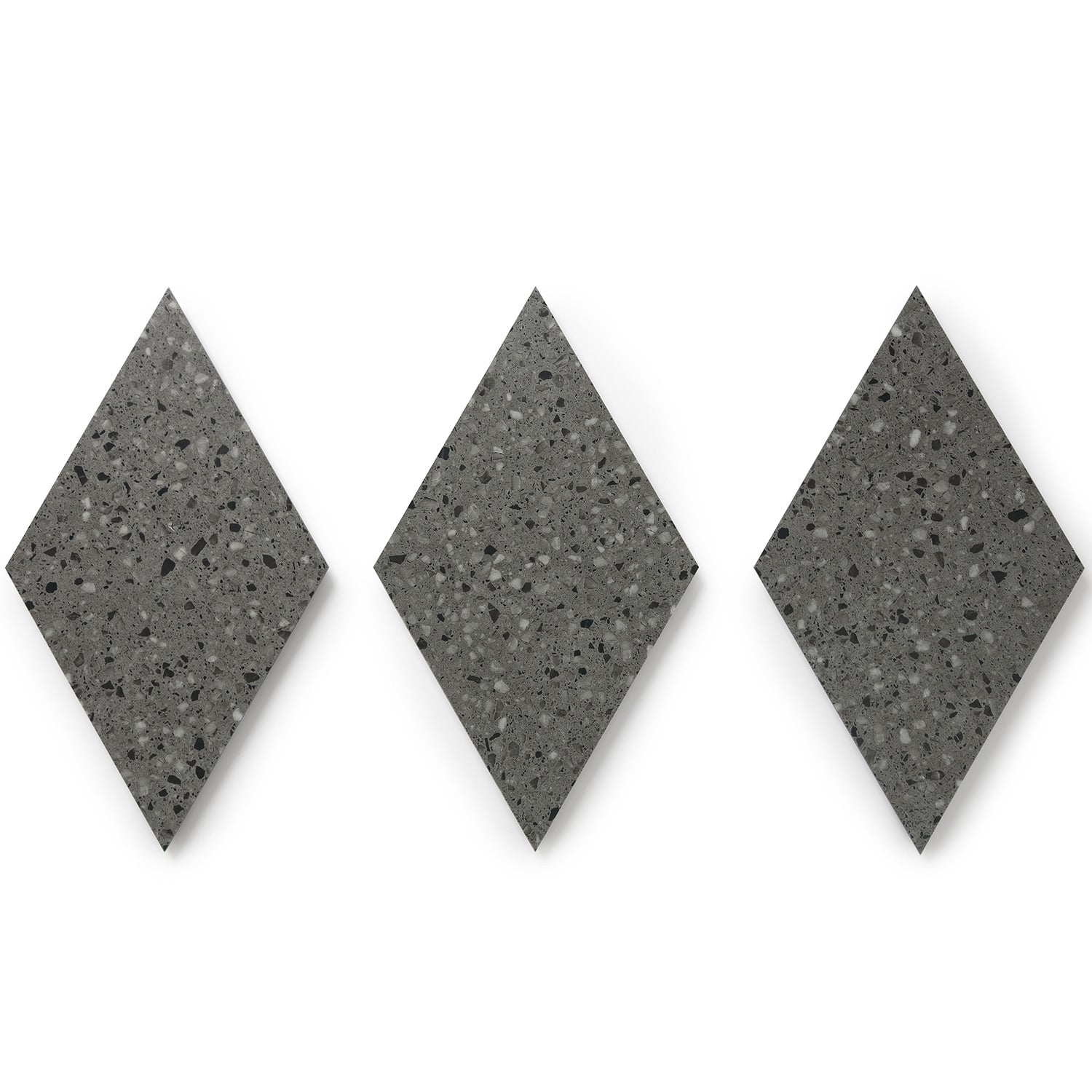 A: Each rhombus tile measures approximately 9.75 in W x 17 in L and 3 mm thick.