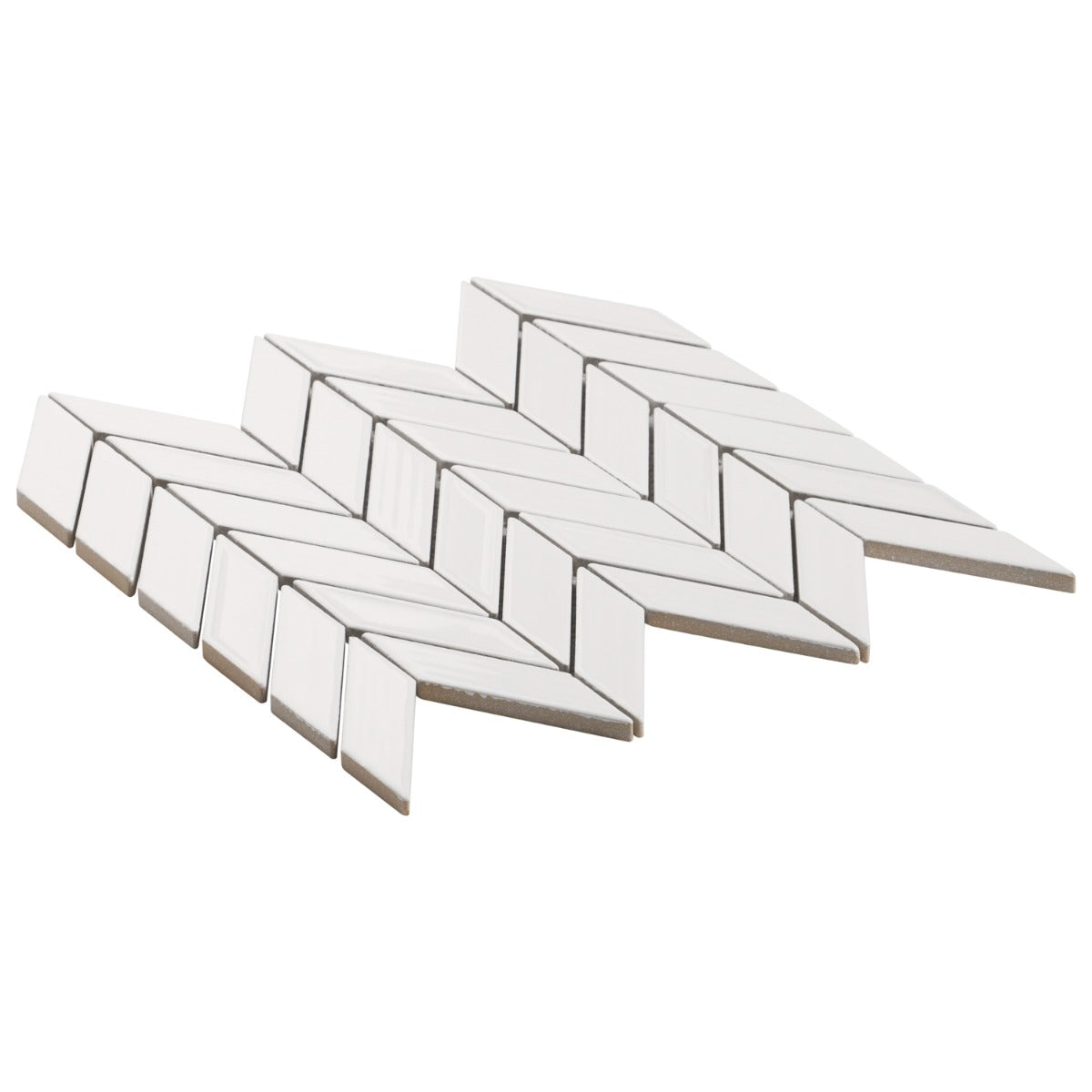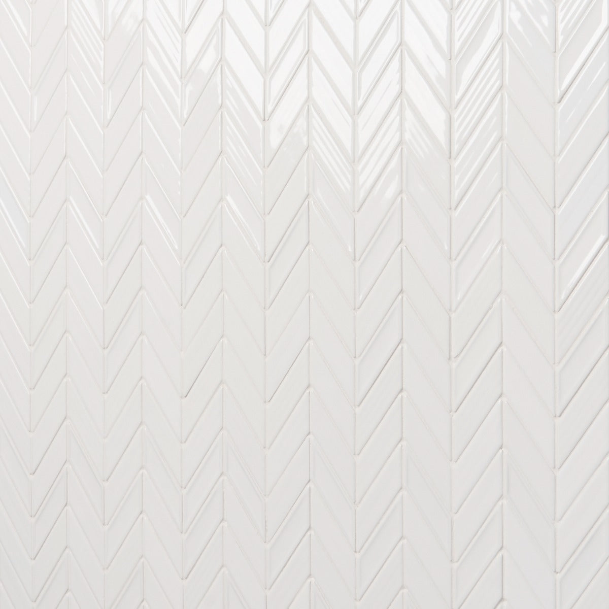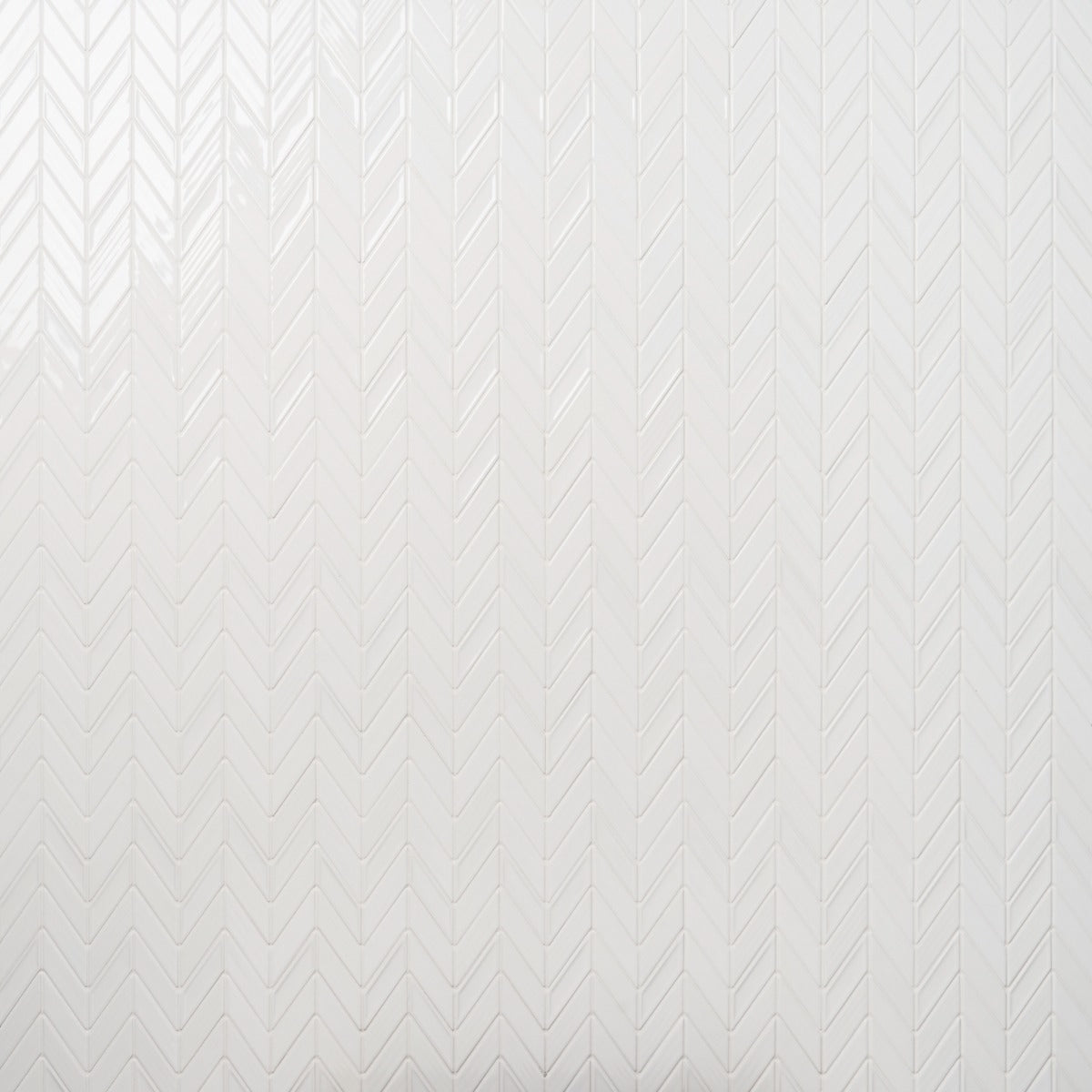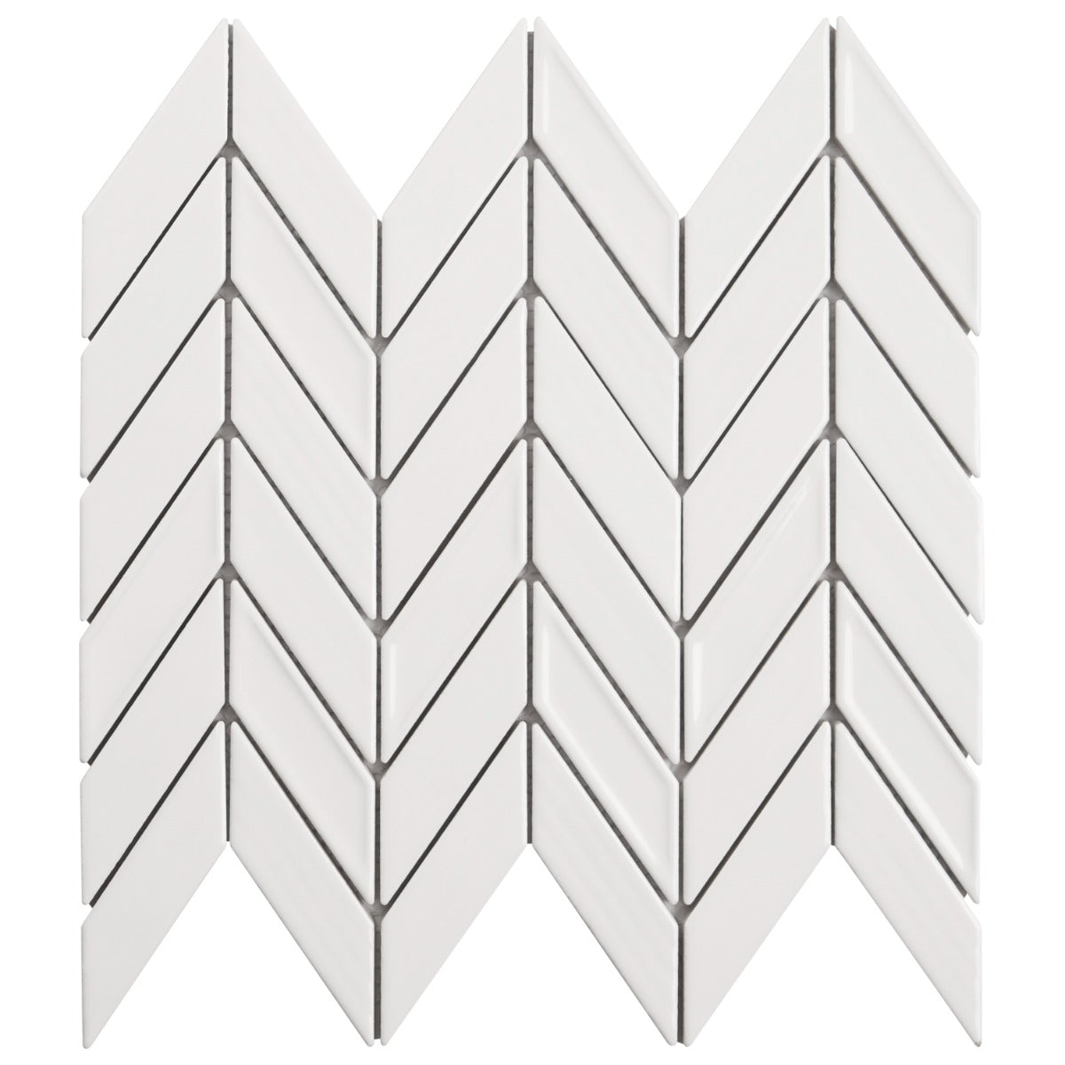 The Brookline Chevron Cloud White Glossy Ceramic Mosaic Tile features a modern chevron pattern with a glossy finish, perfect for adding a touch of elegance to any wall. Made from durable double-fired ceramic, it combines style with practicality.
