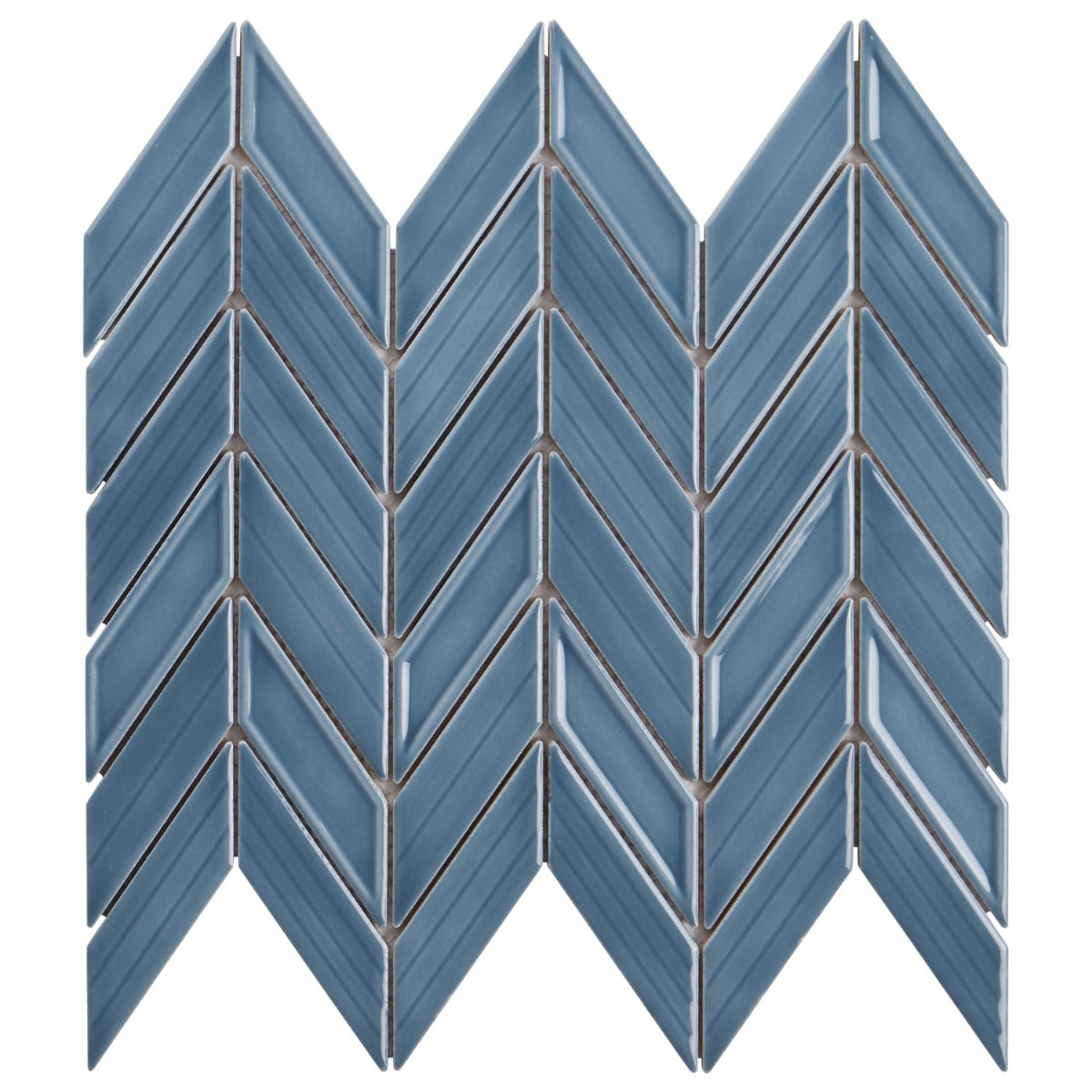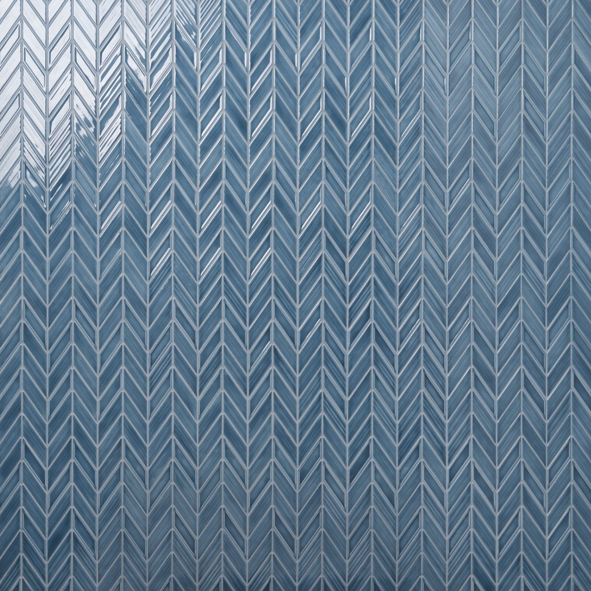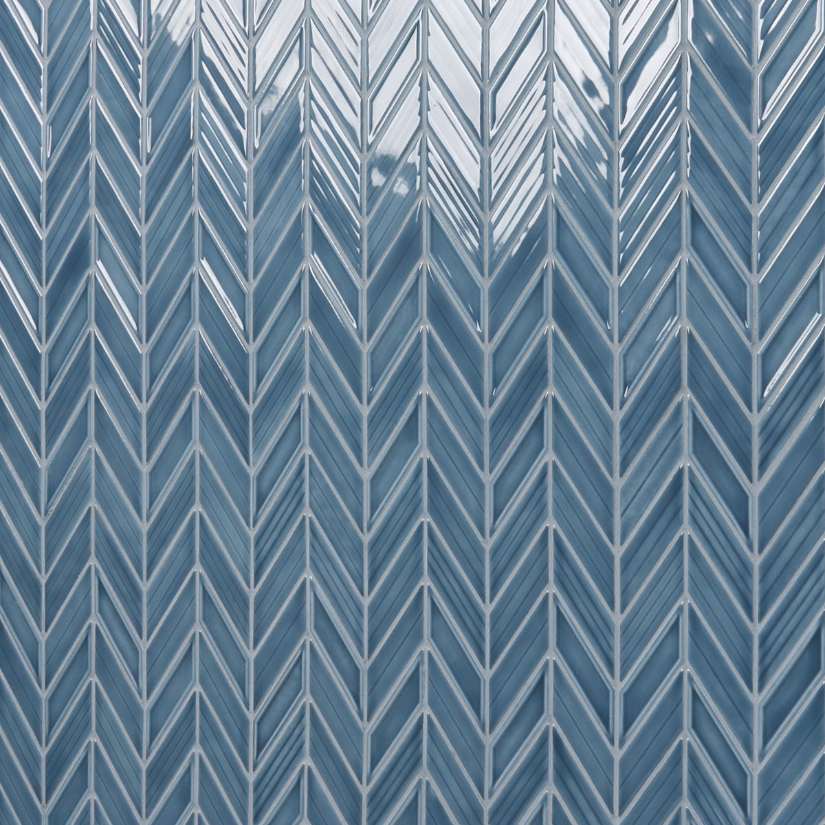The Brookline Chevron Coastal Blue Mosaic Tile features a stunning chevron pattern in a glossy light blue glaze. Made from durable double-fired ceramic, it adds a modern and elegant touch to any wall.
