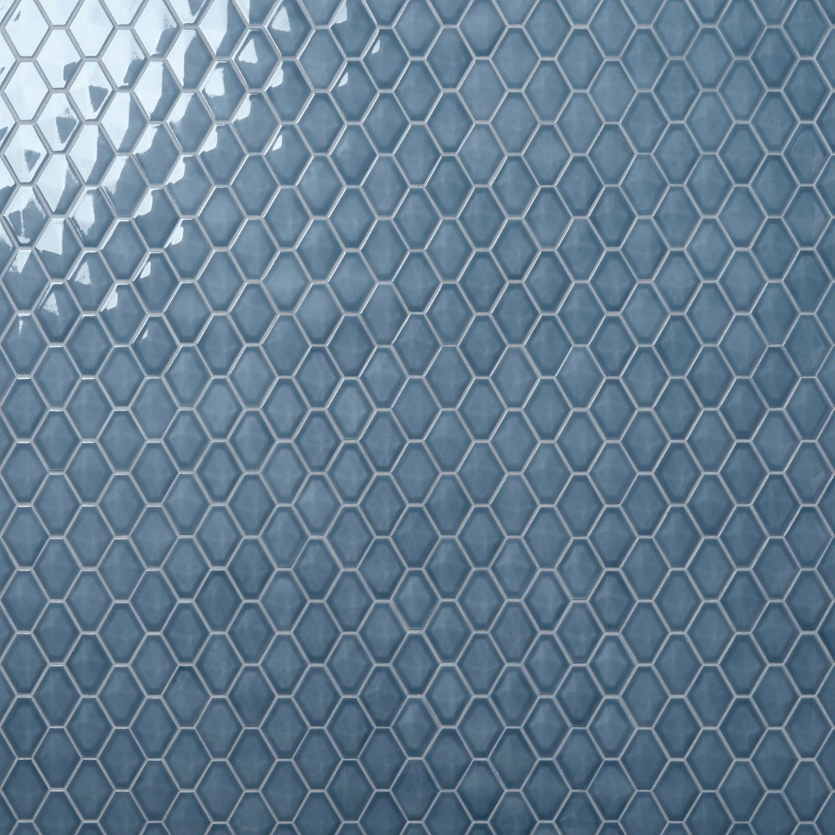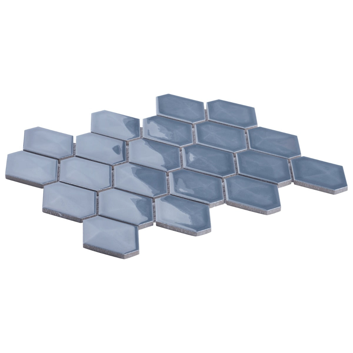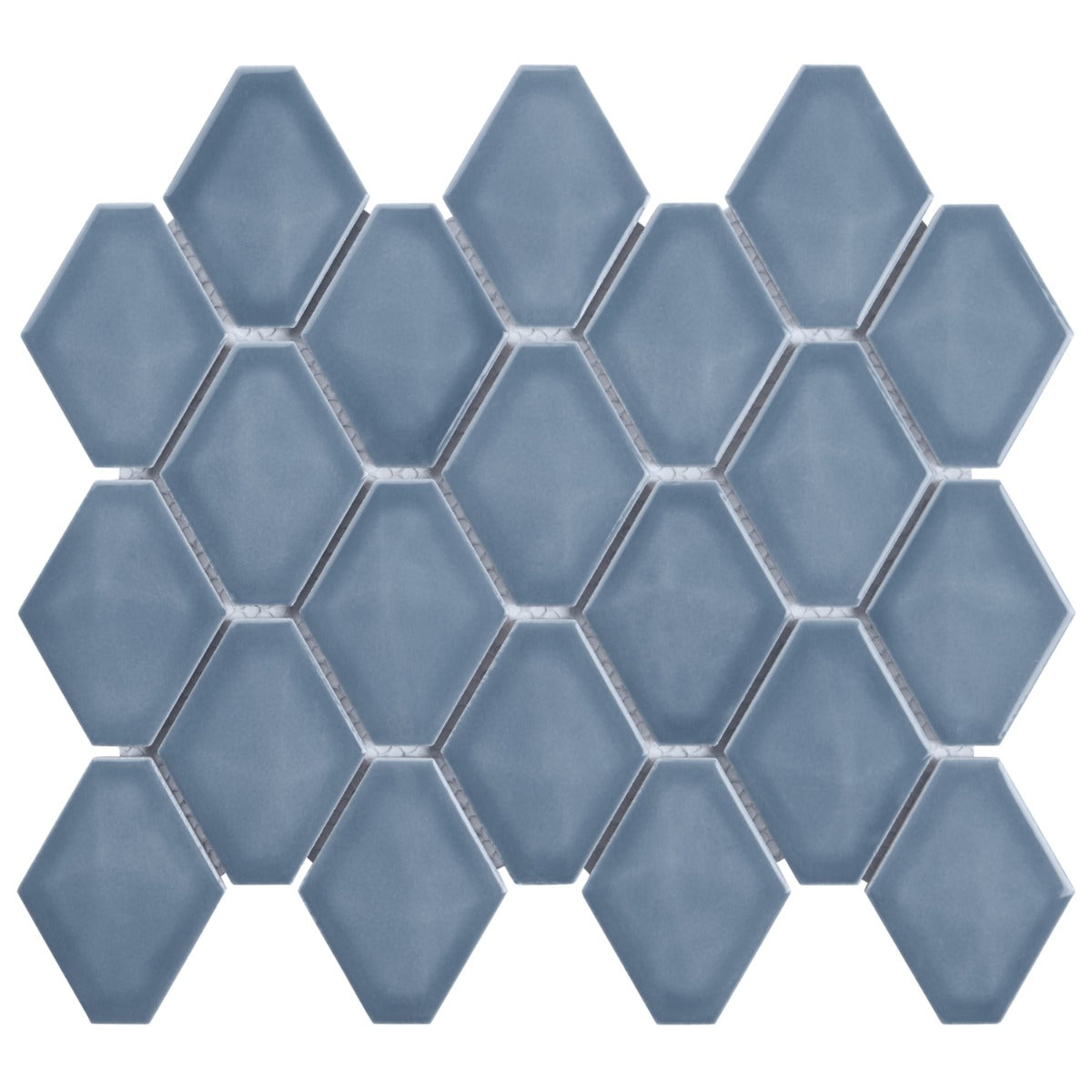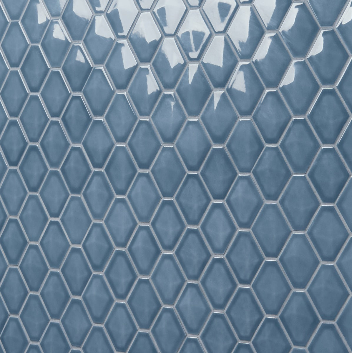 The Brookline Diamond Coastal Blue Mosaic Tile features a glossy finish and a unique diamond pattern, perfect for adding a modern touch to walls. Made from durable double-fired ceramic, it offers a rich blue hue and easy installation with mesh backing.
