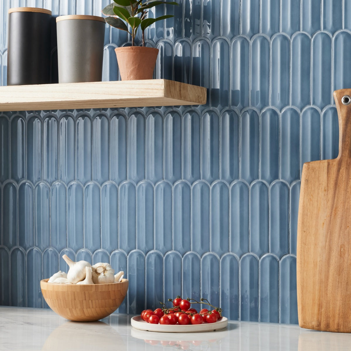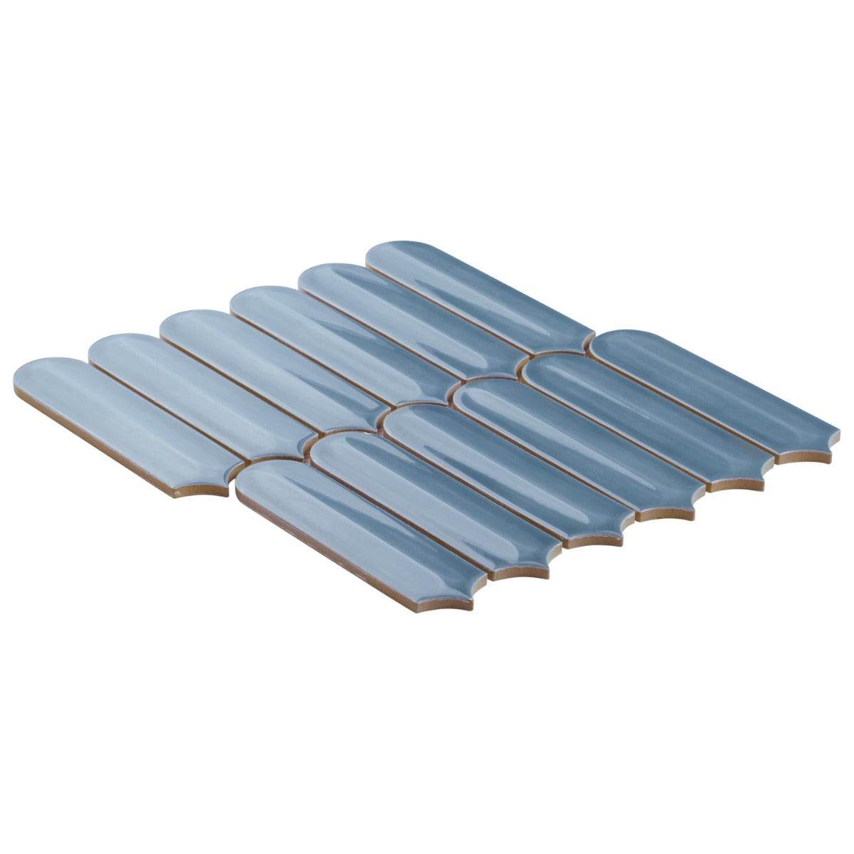 The Brookline Feather Coastal Blue Fish Scale Glossy Ceramic Mosaic Tile features a unique scallop-inspired design with a glossy finish, perfect for adding a modern touch to walls. Made from double-fired ceramic, it offers durability and a rich, saturated hue.