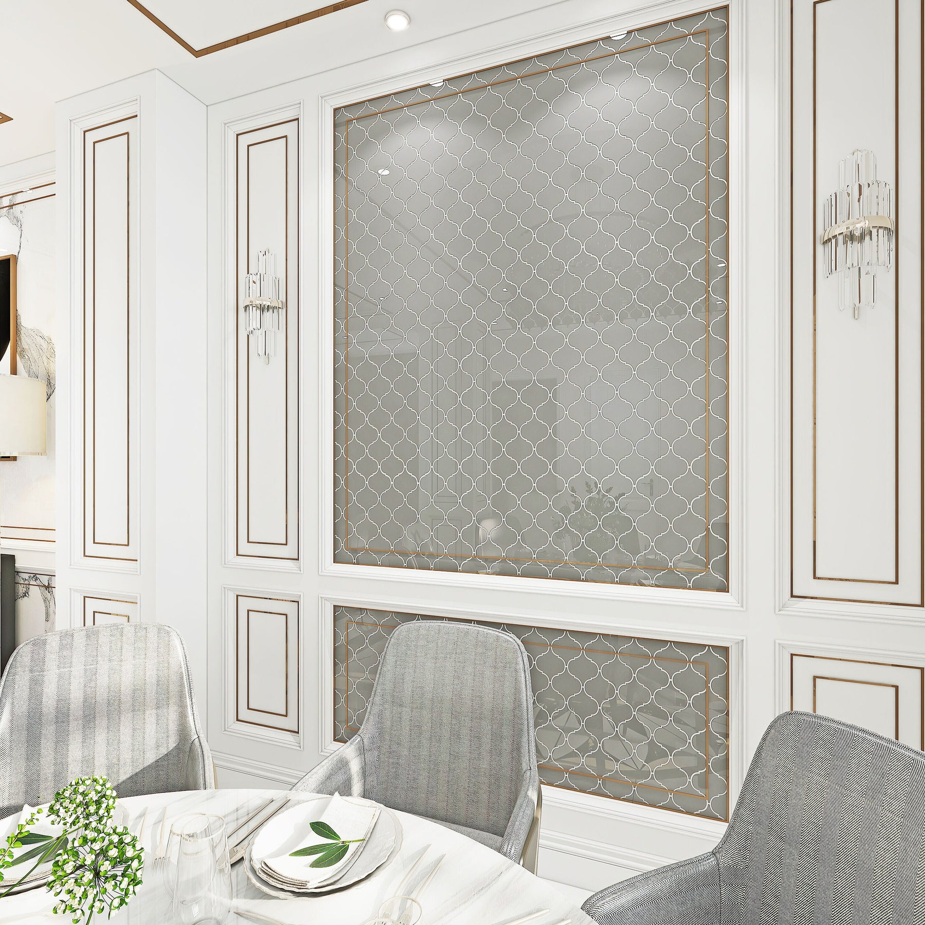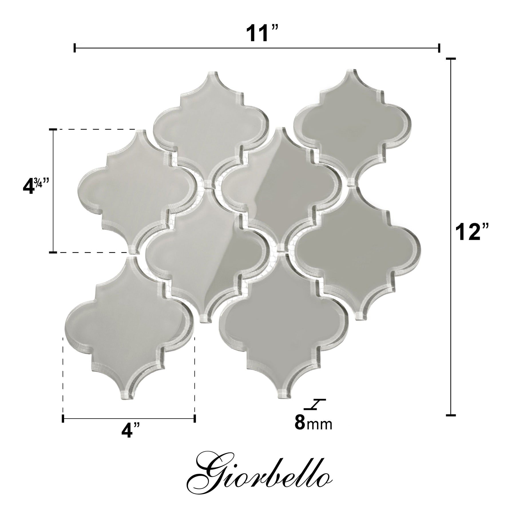 Elevate your space with Giorbello's Light Gray Glossy Glass Arabesque Wall Tile. Its sleek, water-jet cut design and subtle color tone are perfect for both residential and commercial applications, boasting durability and elegance.