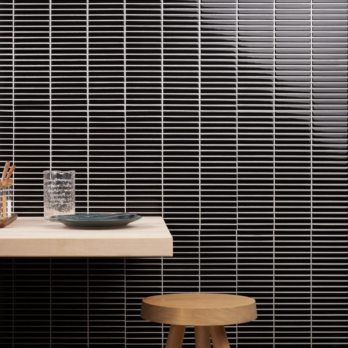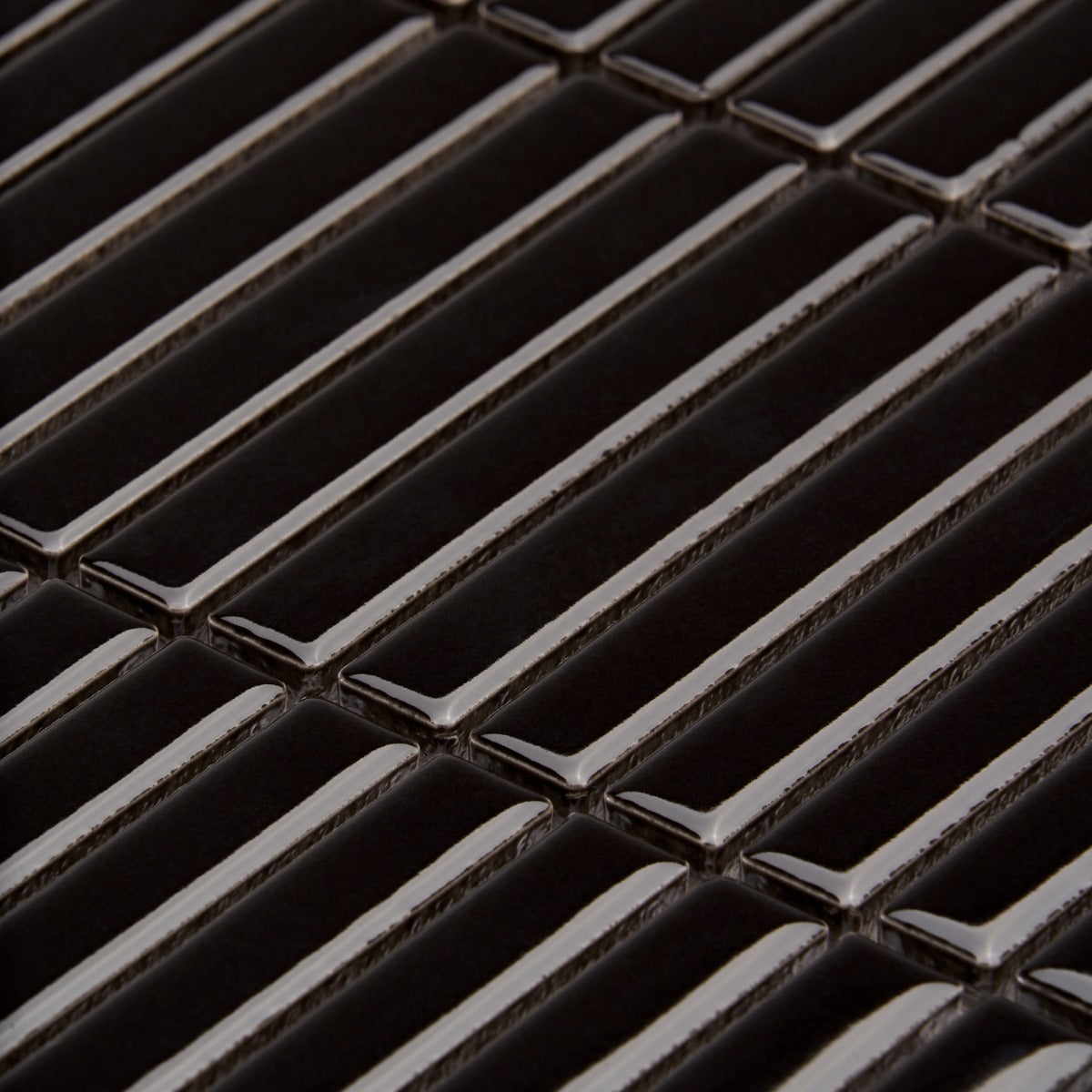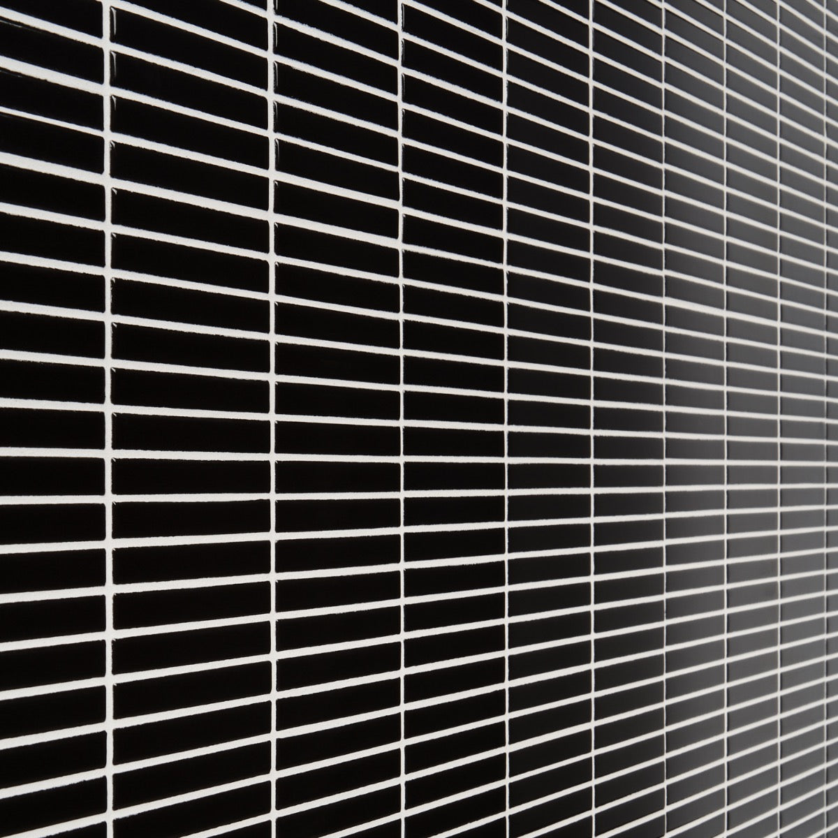 Kai Black Glossy Porcelain Mosaic Tile - 1x4" Tri-Stacked